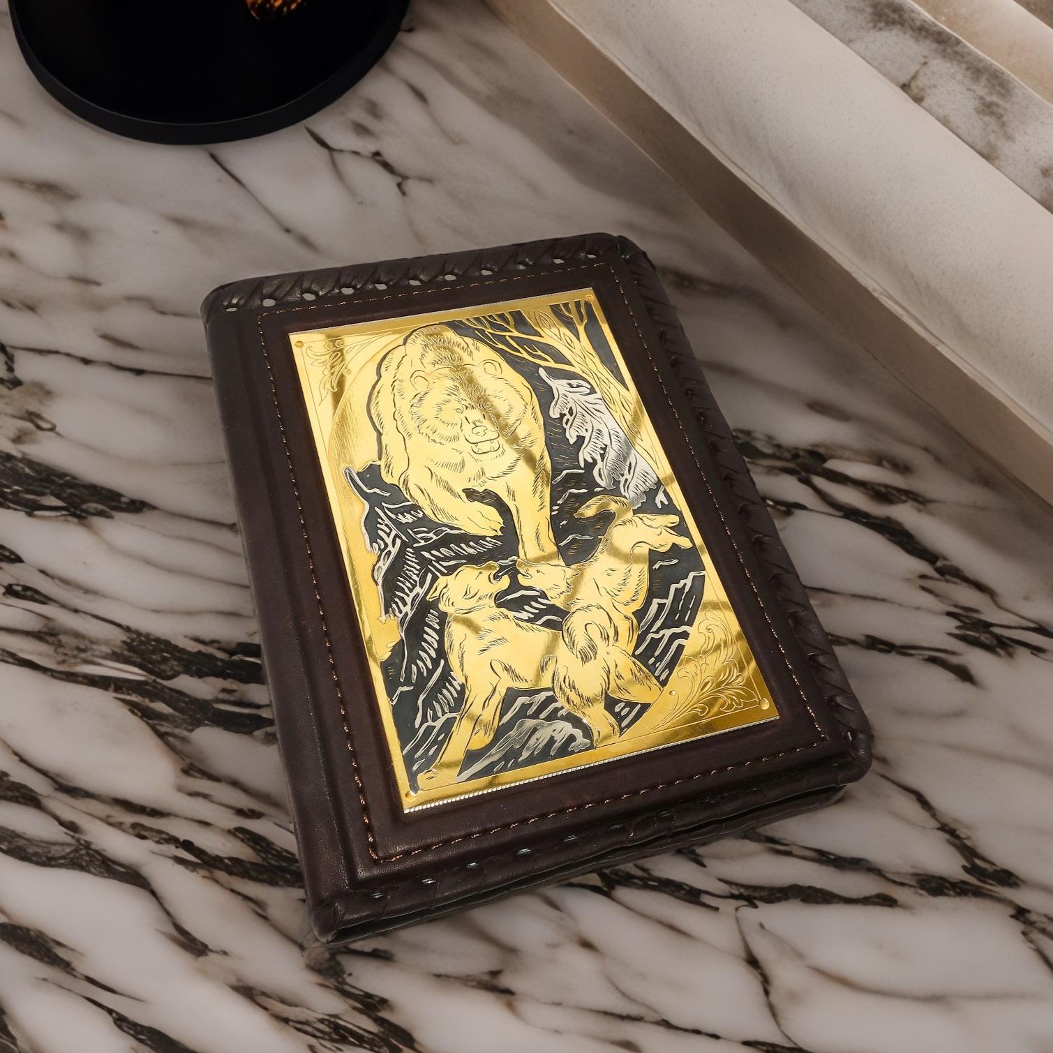Подчеркните свою индивидуальность и уникальный стиль с помощью нашей люксовой кожаной обложки на паспорт. Изготовленная из высококачественной, натуральной кожи, эта обложка обладает тонкой элегантностью, которую сложно превзойти. Каждая обложка украшена сложной и высоко детализированной гравировкой охоты с собаками на медведя, выполненной по технологии златоустовской гравюры. Запечатлев эту классическую тему русской охоты, мы создали не только красивый, но и неповторимый аксессуар. Для того, чтобы сделать вашу обложку еще более роскошной, мы дополнили гравировку золочением. Этот классический способ украшения придает обложке изысканный блеск и делает ее еще более впечатляющей в коричневом цвете натуральной кожи.