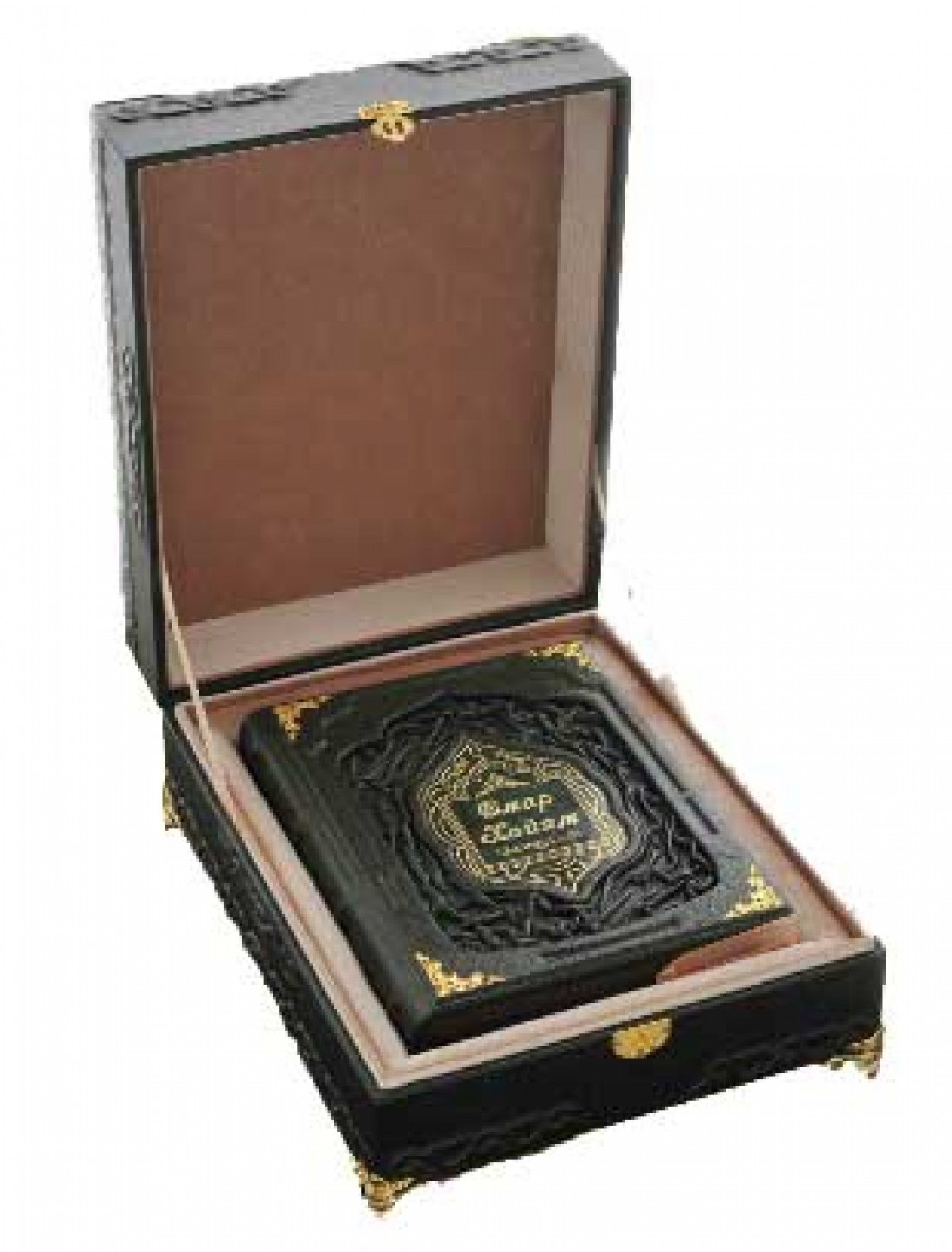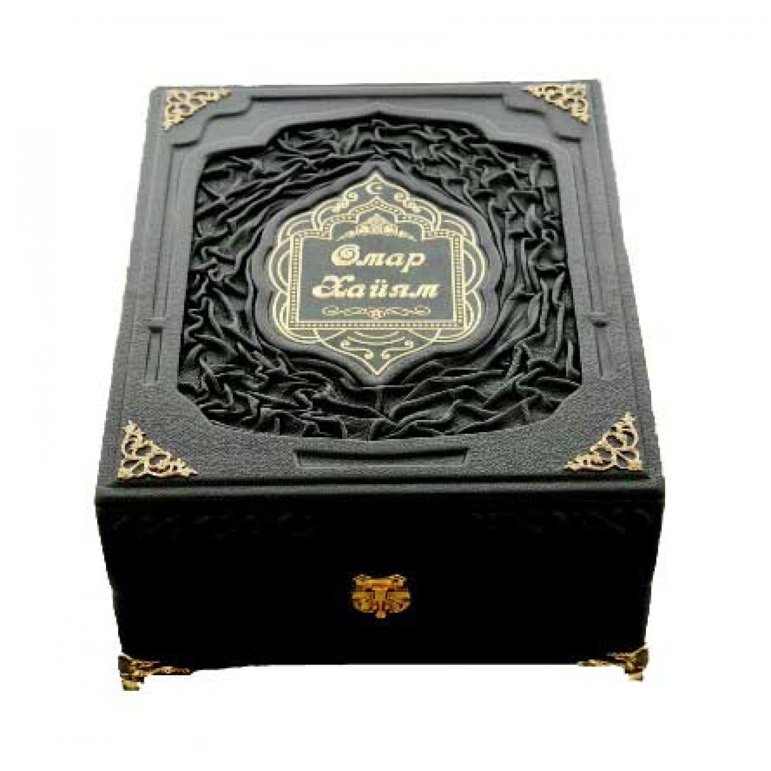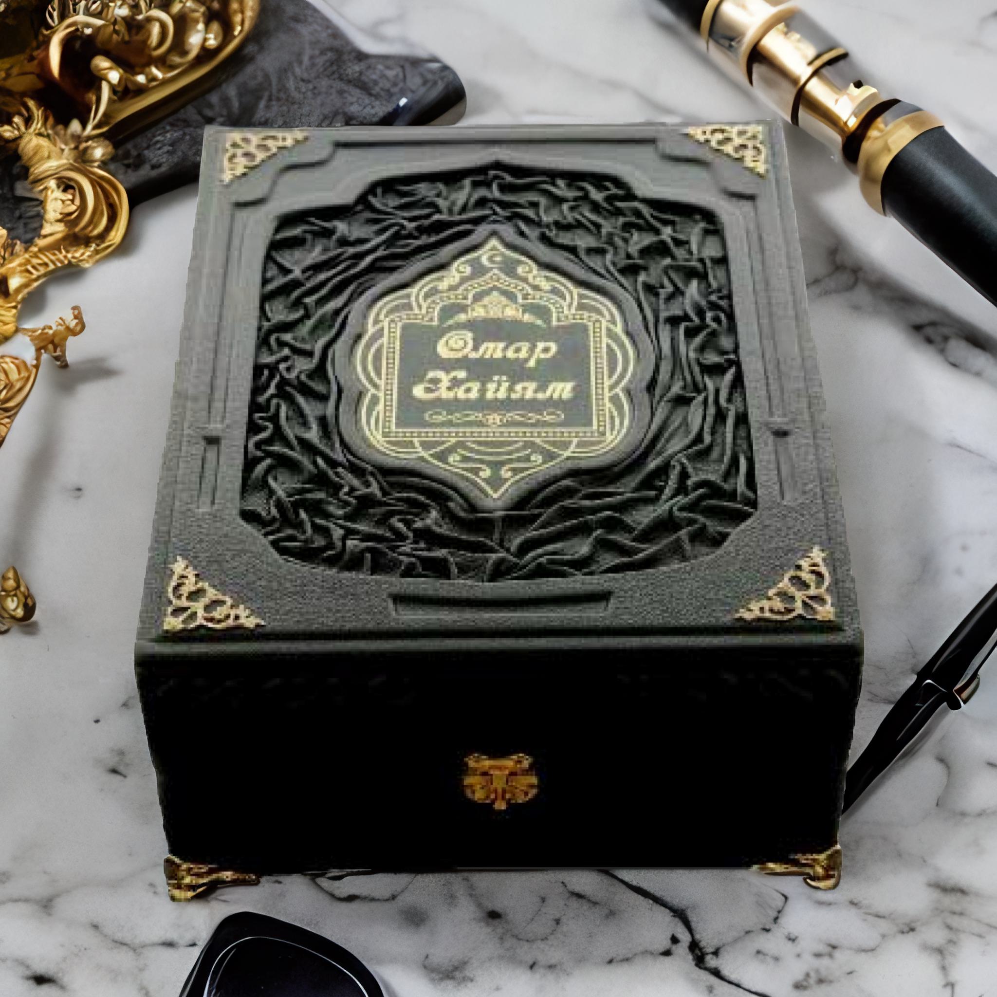 Уникальное собрание восточной мудрости можно преподнести человеку в качестве особого дорогого подарка и в коробе. Преимуществом такого подарка будет не только увеличение его статусности, но и наличие необходимого места для хранения издания. Короб обтягивается дорогой импортной кожей, в центре красуется декоративная вставка, обрамленная тиснением. Богатый вид изделию придают боковые узоры, выполненные в виде позолоты и качественная фурнитура. Замок на коробе будет сохранять свою функциональность долгие годы, а сам короб может служить выставочной площадкой для издания. В качестве семейной реликвии «Омар Хайям и персидские поэты х-хvɪ века» можно передавать из поколения в поколение именно в такой защитной оболочке. Вся конструкция поставлена на железные ножки, поэтому с виду короб напоминает большую шкатулку. Внутри книга аккуратно укладывается на ткань, она не дает ей испытывать на себе негативное влияние пыли и влаги, в то время как остальная часть создает герметичное пространство для хранения. Автор отлично продумал общую композицию и идеально подобрал узор на центральной вкладке. Именно такие формы имеют восточные рисунки. В качестве одного из главных украшений выступает мусульманский символ над названием книги, хранящейся в коробе. Содержание страниц и их оформление иллюстрациями имеет общие черты с оформлением короба, во почему он вместе с книгой представляет собой единое целое. Кол-во иллюстраций: 1 684. Короб: Накладка - гравировка на металле Книга: Накладка - гравировка на металле |