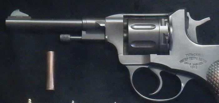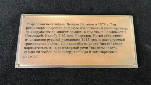 Револьвер наган разработан бельгийцем Леоном Нанагом в 1878 г. Эти револьверы получили широкую известность и были приняты на вооружение во многих армиях, в том числе Российской и Советской. Калибр 7,62 mm, 7 зарядов. Наган стал одним из символов русской революции 1917 года и последующей гражданской войны, а в дальнейшем слово «наган» стало нарицательным — в разговорной речи «наганом» часто называли любой револьвер, а иногда и саморазрядный пистолет. |