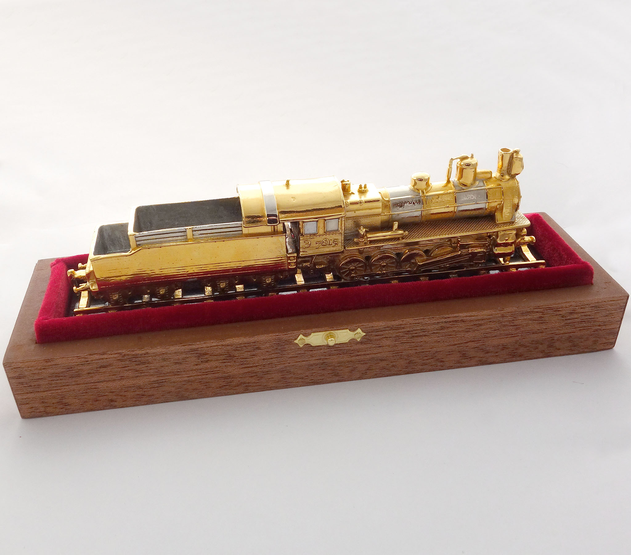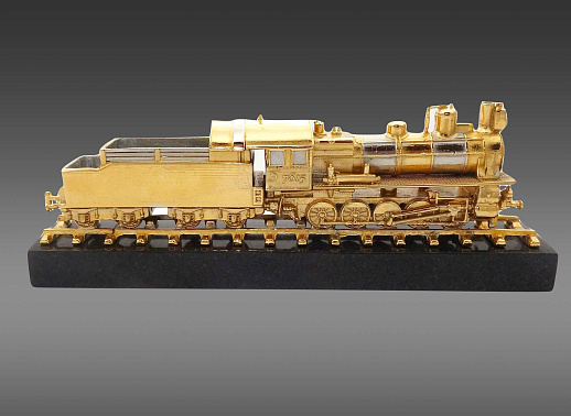 Паровоз выполнен из бронзы и покрыт тонким слоем золота, что придает ему особый блеск и шик. Основание для паровоза изготовлено из долерита, что придает модели дополнительную устойчивость и прочность. |