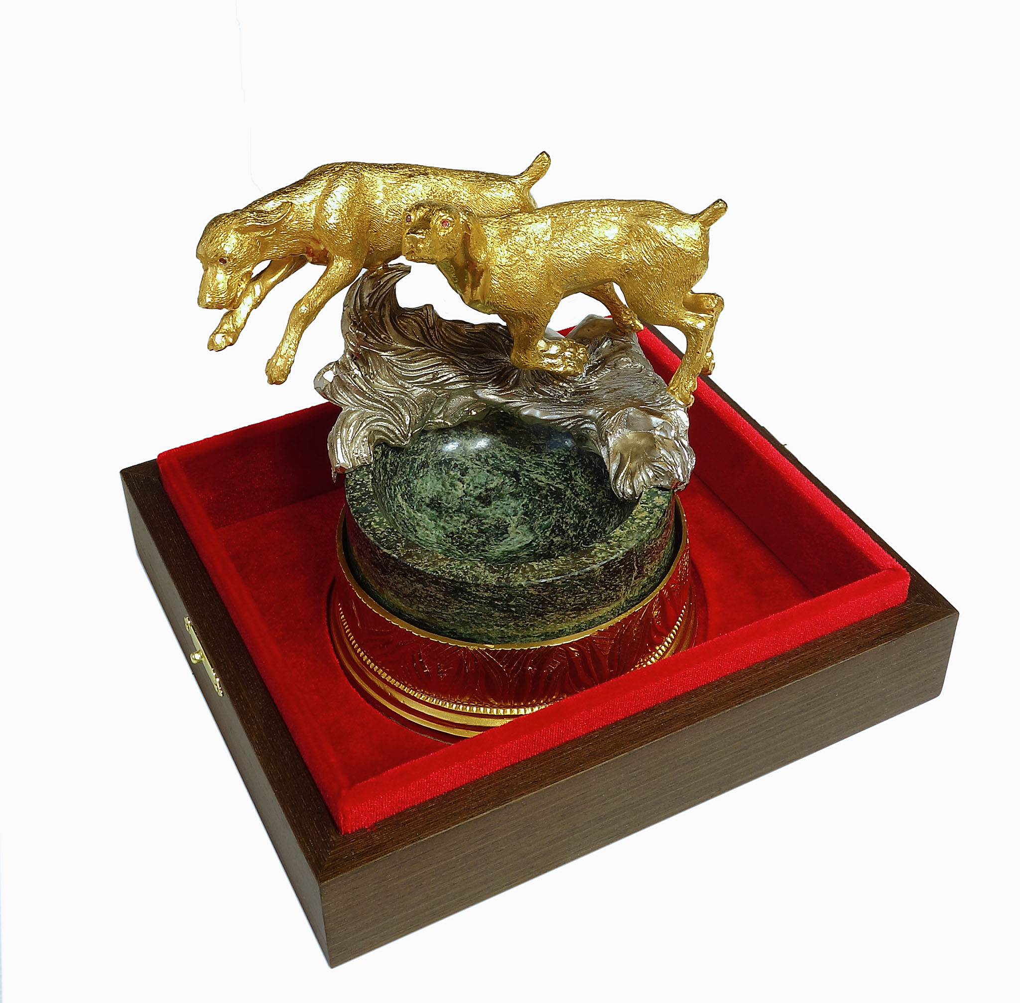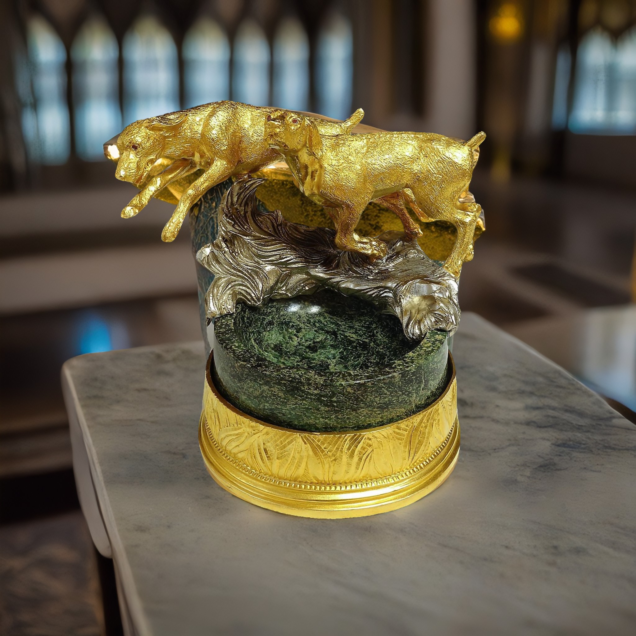 Элегантная пепельница "Гончие" объединяет в себе благородство материалов и изысканный дизайн. Две грациозных гончих, искусно выполненных из бронзы, охраняют чашу пепельницы, изготовленную из уникального змеевика. Детальное изображение собак делает эту пепельницу поистине эксклюзивной. Она идеально подойдет любителям собак, охотникам или просто ценителям изысканных предметов интерьера. Этот предмет не только практичен в использовании, но и является настоящим произведением искусства. Она привнесет атмосферу уюта и благородства в ваш дом или офис, став прекрасным украшением и дополнением к любому интерьеру. |