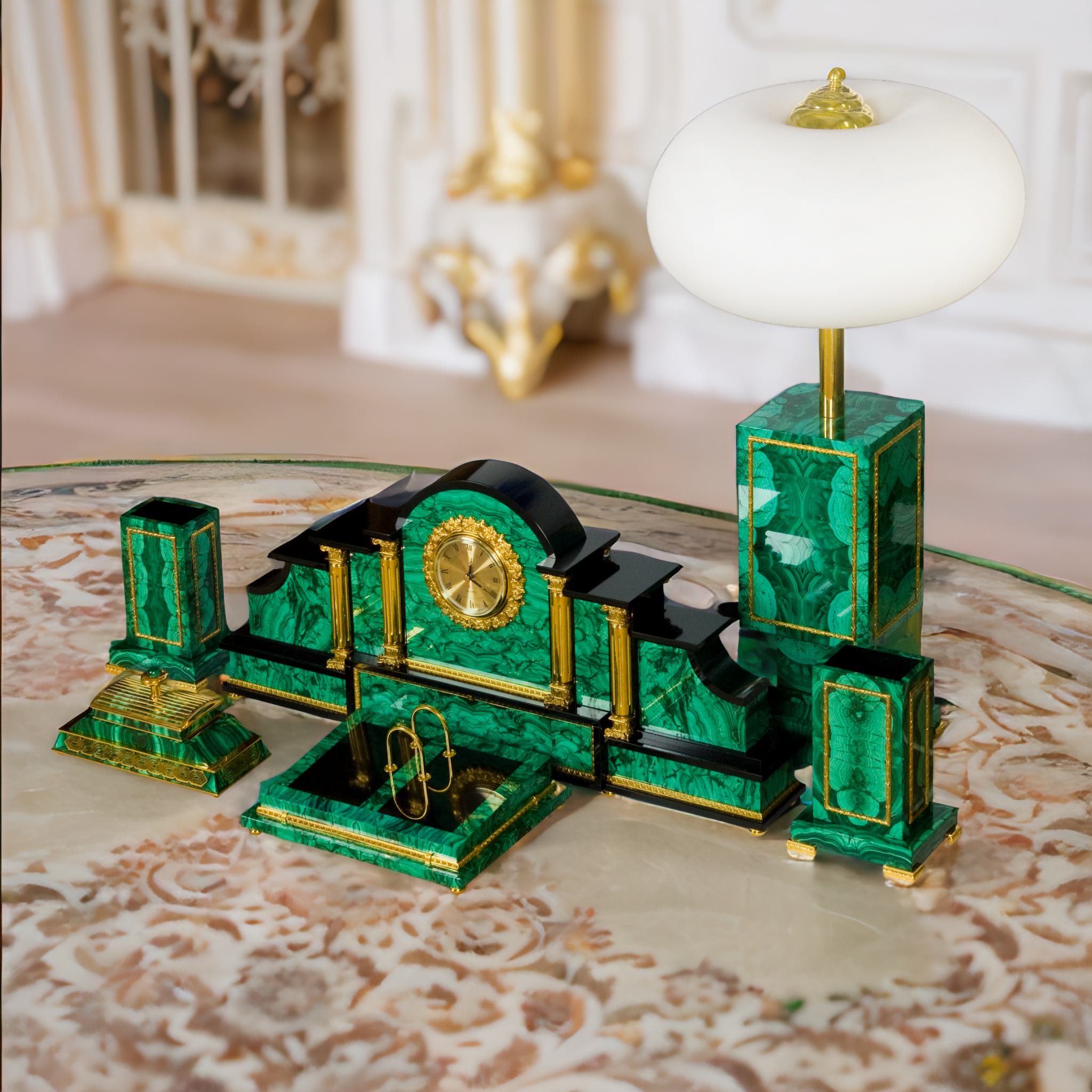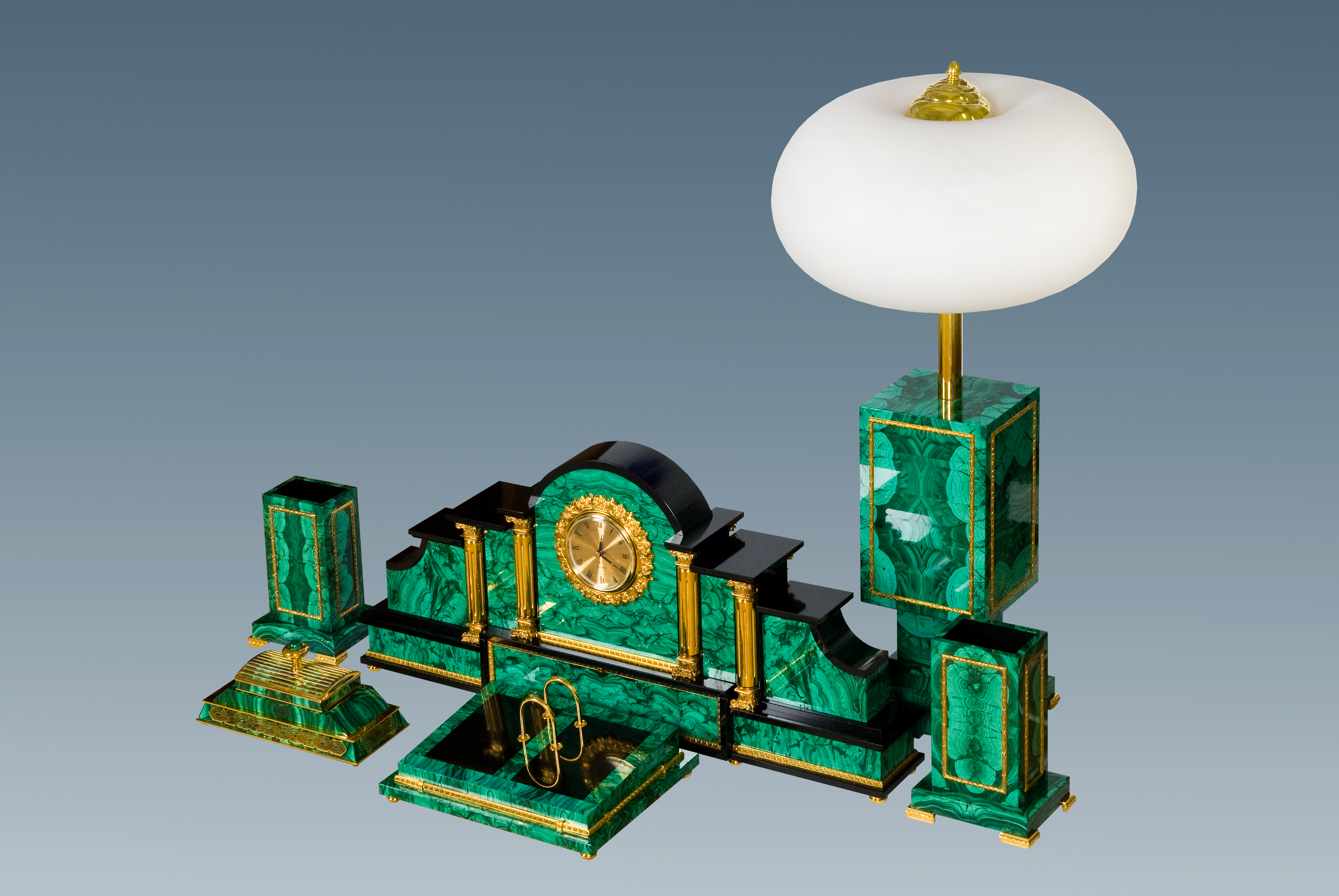 Уникальные в своем роде, престижные и высокого качества предметы роскоши — письменный набор Казбек. Он изготовлен руками мастеров из натурального Малахита и Долерита, внесет в ваш интерьер особенное изящество и благородство. Комплектация этого эксклюзивного набора очень продумана и включает в себя: