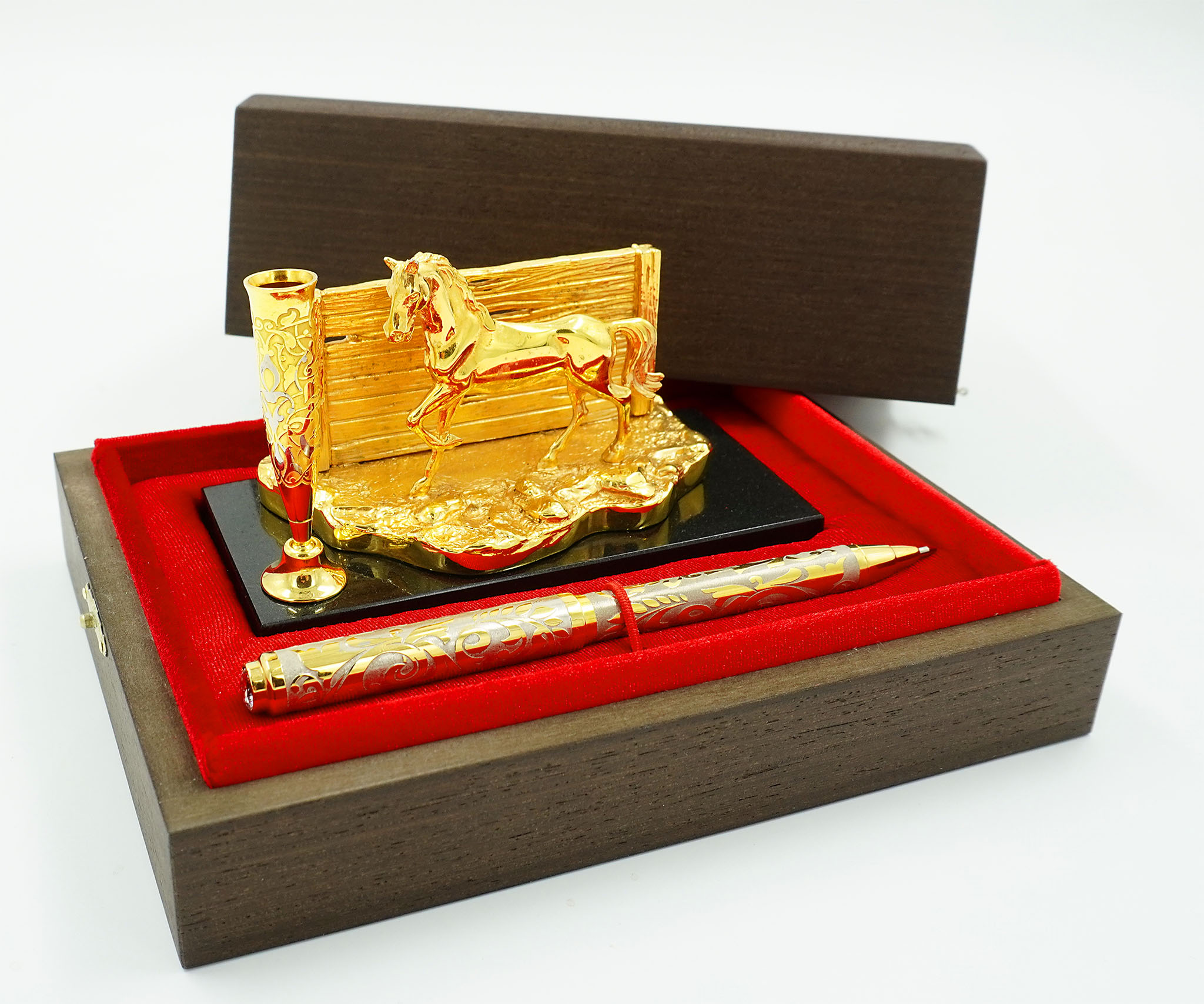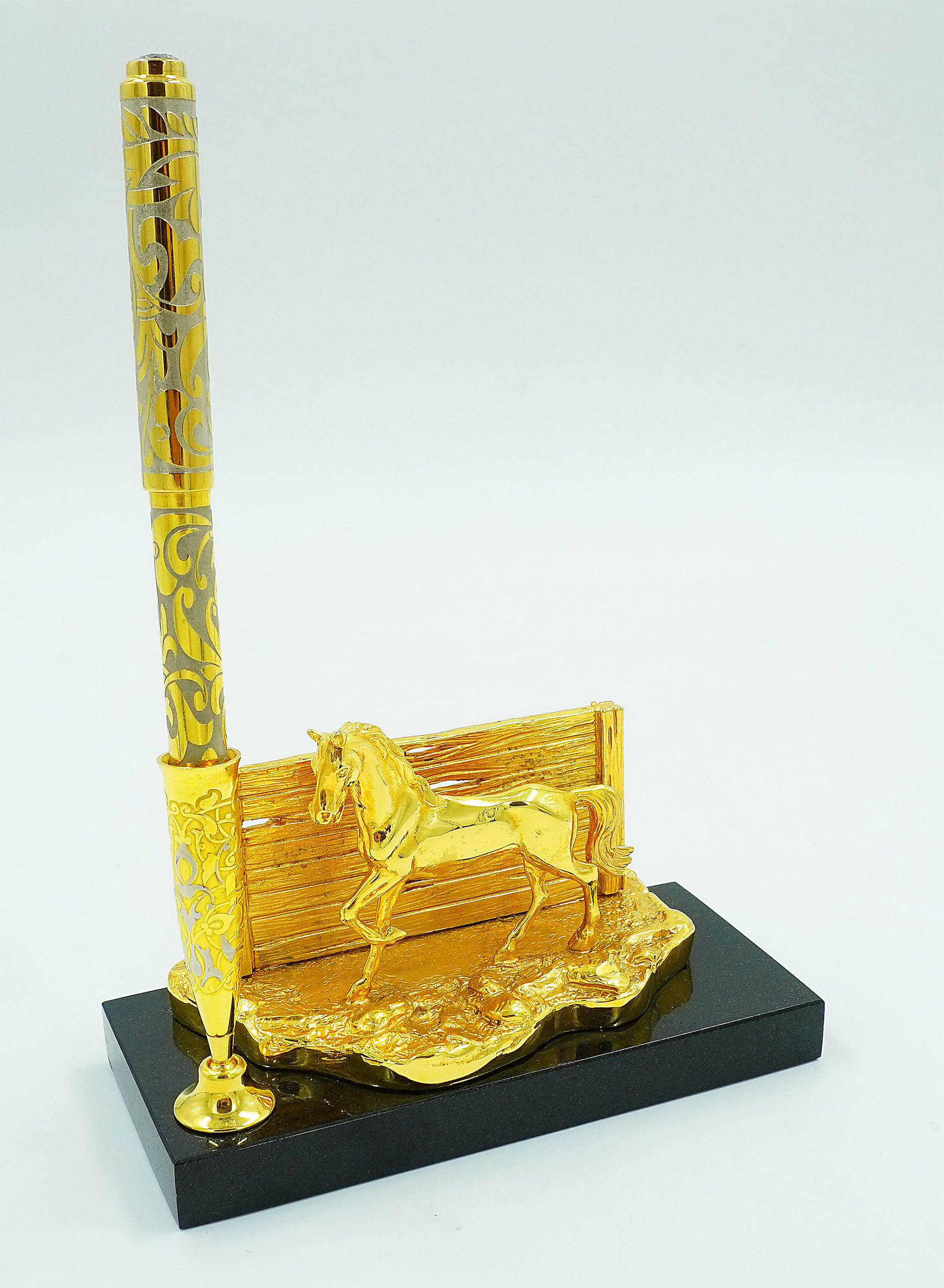 Элегантный письменный набор "Лошадь" станет изысканным украшением вашего рабочего стола. Центральным элементом является бронзовая статуэтка лошади, которая служит подставкой для визиток. Этот уникальный аксессуар дополнен позолоченной ручкой, мастерски выполненной в технологии златоустовской гравюры, что делает каждый экземпляр по-настоящему особенным. Все это великолепие расположено на твердом основании из долерита. Такой письменный набор станет отличным подарком для бизнесменов, руководителей и всех тех, кто ценит изысканные и функциональные предметы в своем офисе. |