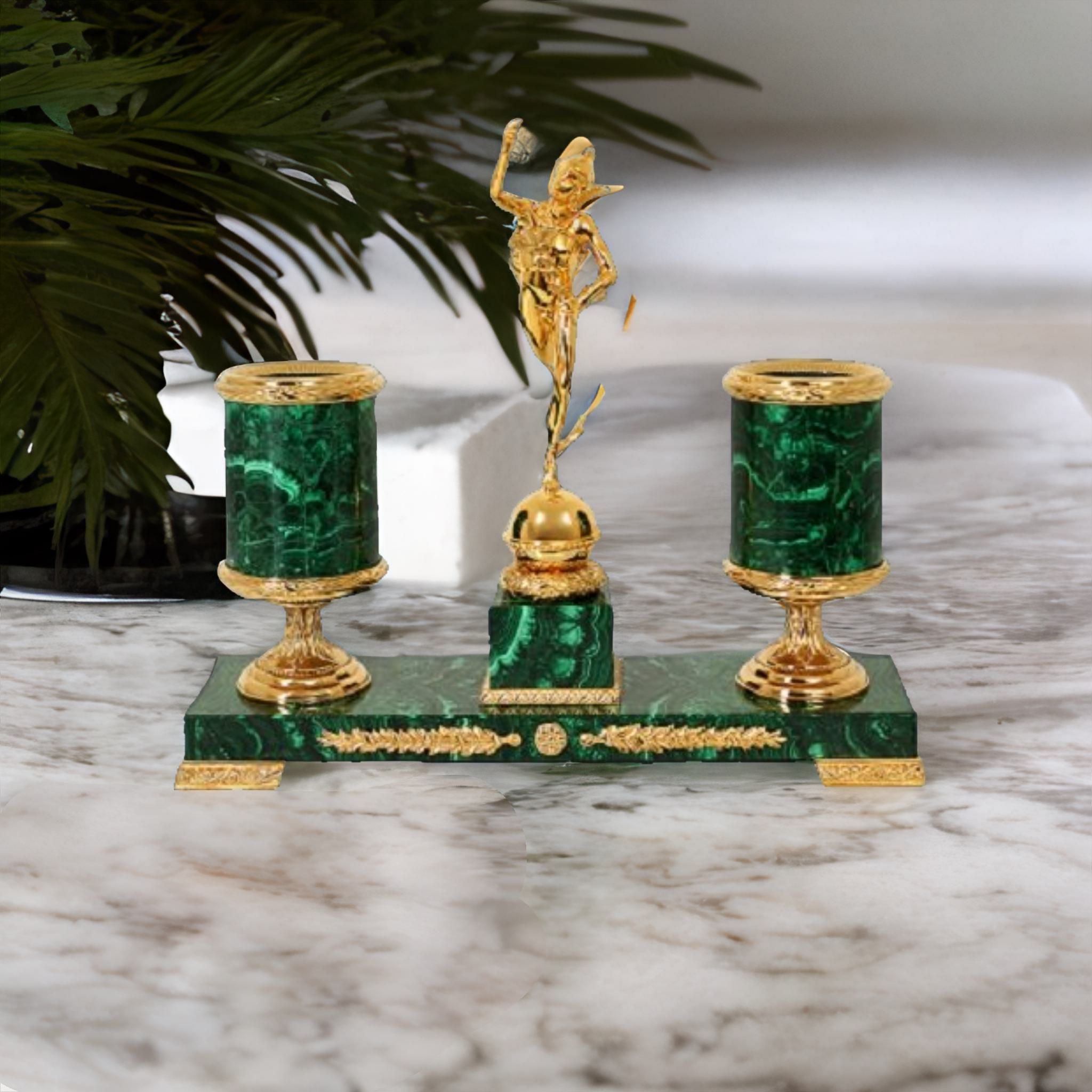 Приведите свое письмо на новый уровень с нашим эксклюзивным письменным прибором Гермес, выполненным из малахита со статуэткой из позолоченной бронзы. Этот необычайно стильный и изысканный аксессуар придаст вашему бюро уникального шарма.