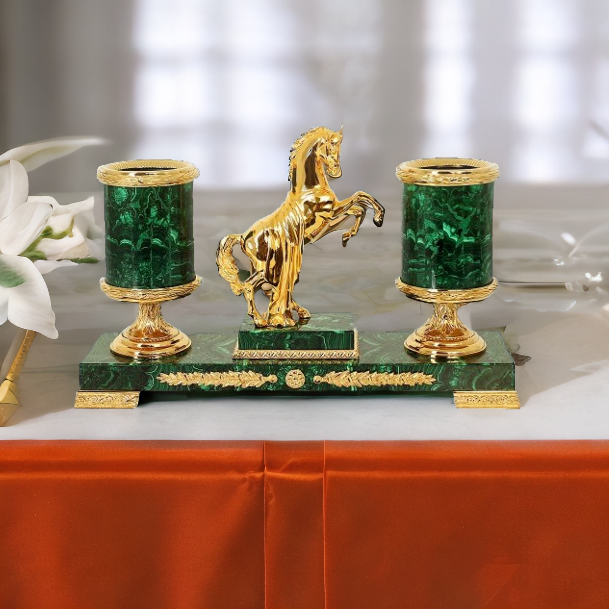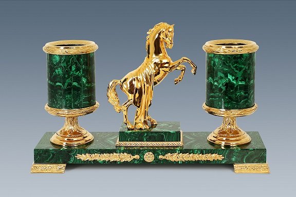 Украшение вашего стола и неповторимый аксессуар вашей повседневности — письменный прибор Конь. Элегантное сочетание прочного малахита и позолоченной бронзы, воплотившихся в образе грациозного скакуна, удивят Вас своей детализацией и высоким качеством исполнения. Мы гарантированно поможем вам подчеркнуть свой статус и безупречный вкус!