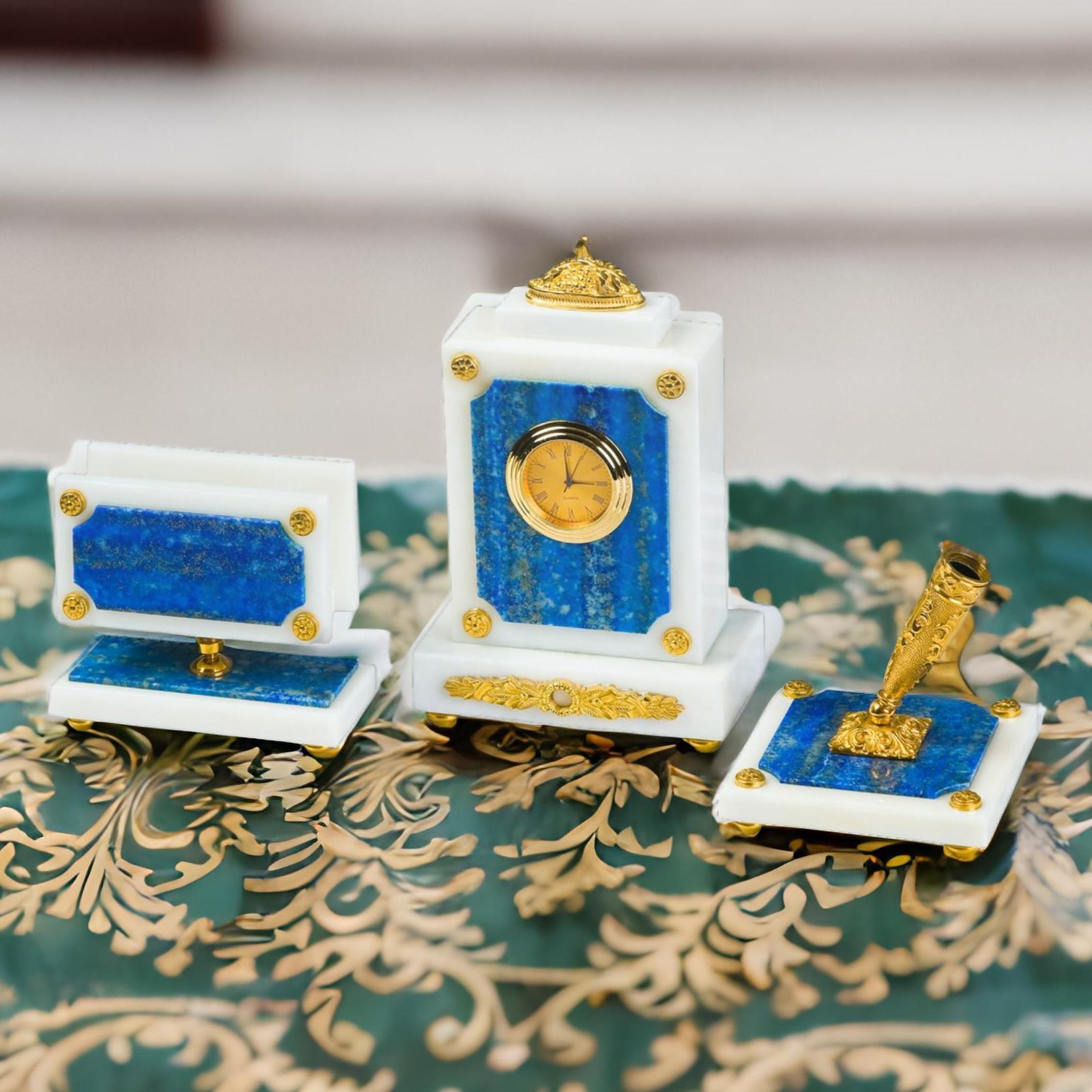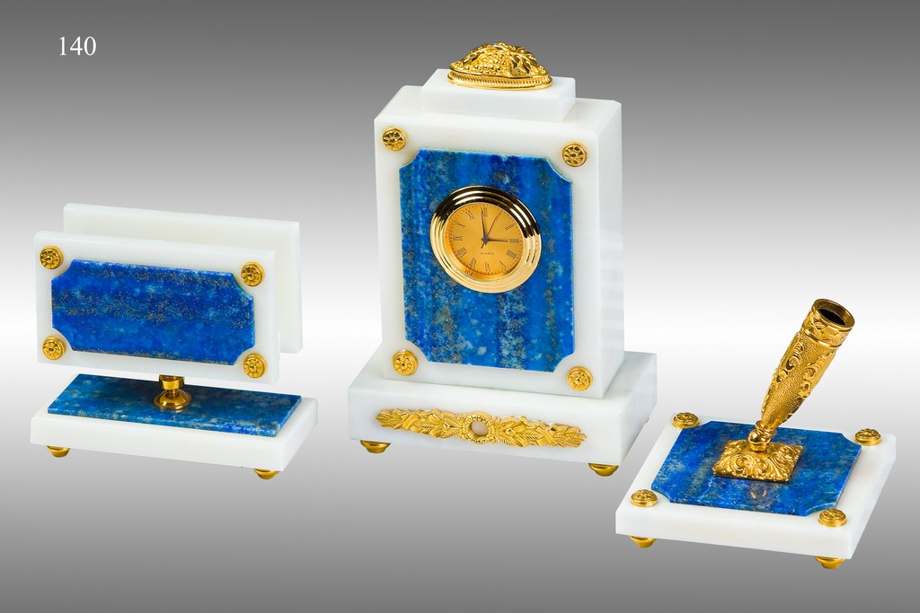 Представляем вам письменный прибор лазурит — совершенство изделия превосходит все ожидания. Этот уникальный продукт украсит ваш стол и подчеркнет вашу индивидуальность и утонченный вкус. Письменный прибор изготовлен из высококачественного лазурита и мрамора, дополненный деталями из бронзы с золочением. Изящество, тонкость выполнения и оригинальность дизайна привлекают внимание и вызывают неподдельное восхищение.