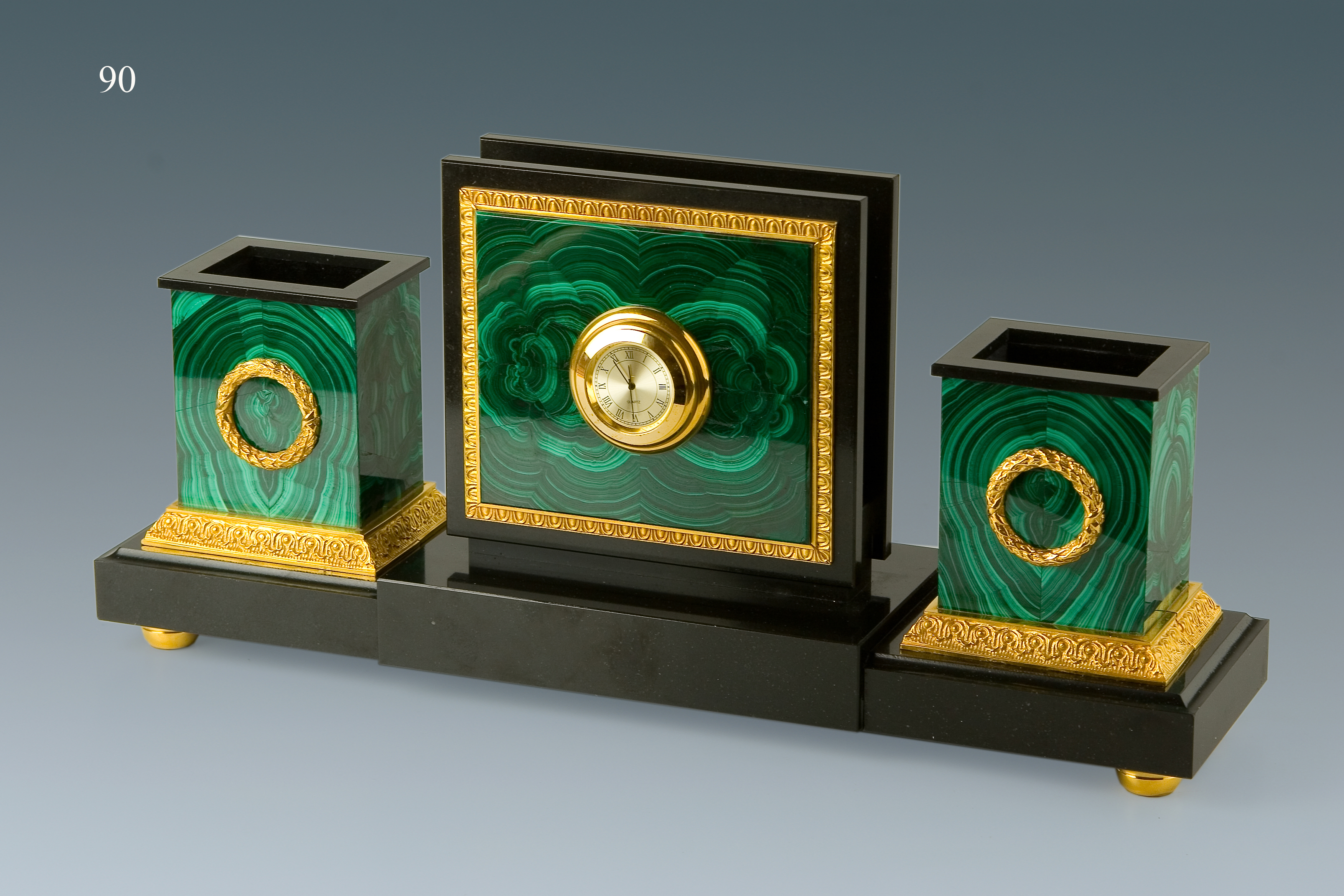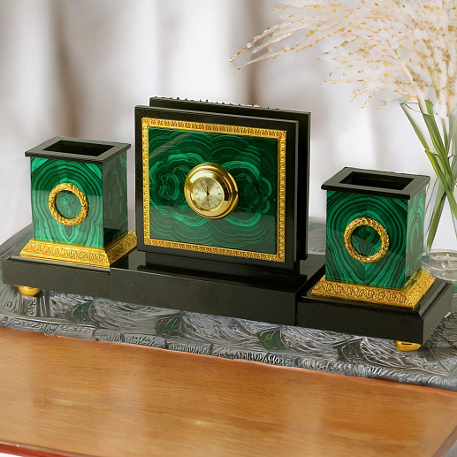 Создайте комфорт и уют на своем рабочем месте с элегантным письменным прибором из малахита! Это по-настоящему стильный и практичный аксессуар, который прекрасно дополнит интерьер вашего кабинета. Настольный набор для руководителя — это не то, что у вас уже есть! Мы предлагаем вам неповторимый набор, сделанный из природного малахита и долерита. Каждый элемент изготовлен мастерами с десятилетним опытом и по-особенному отшлифован, чтобы подчеркнуть уникальную структуру этих минералов. Комплект содержит: