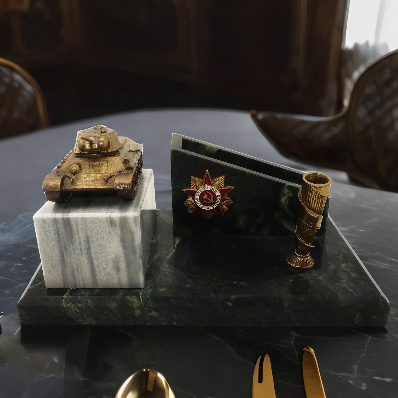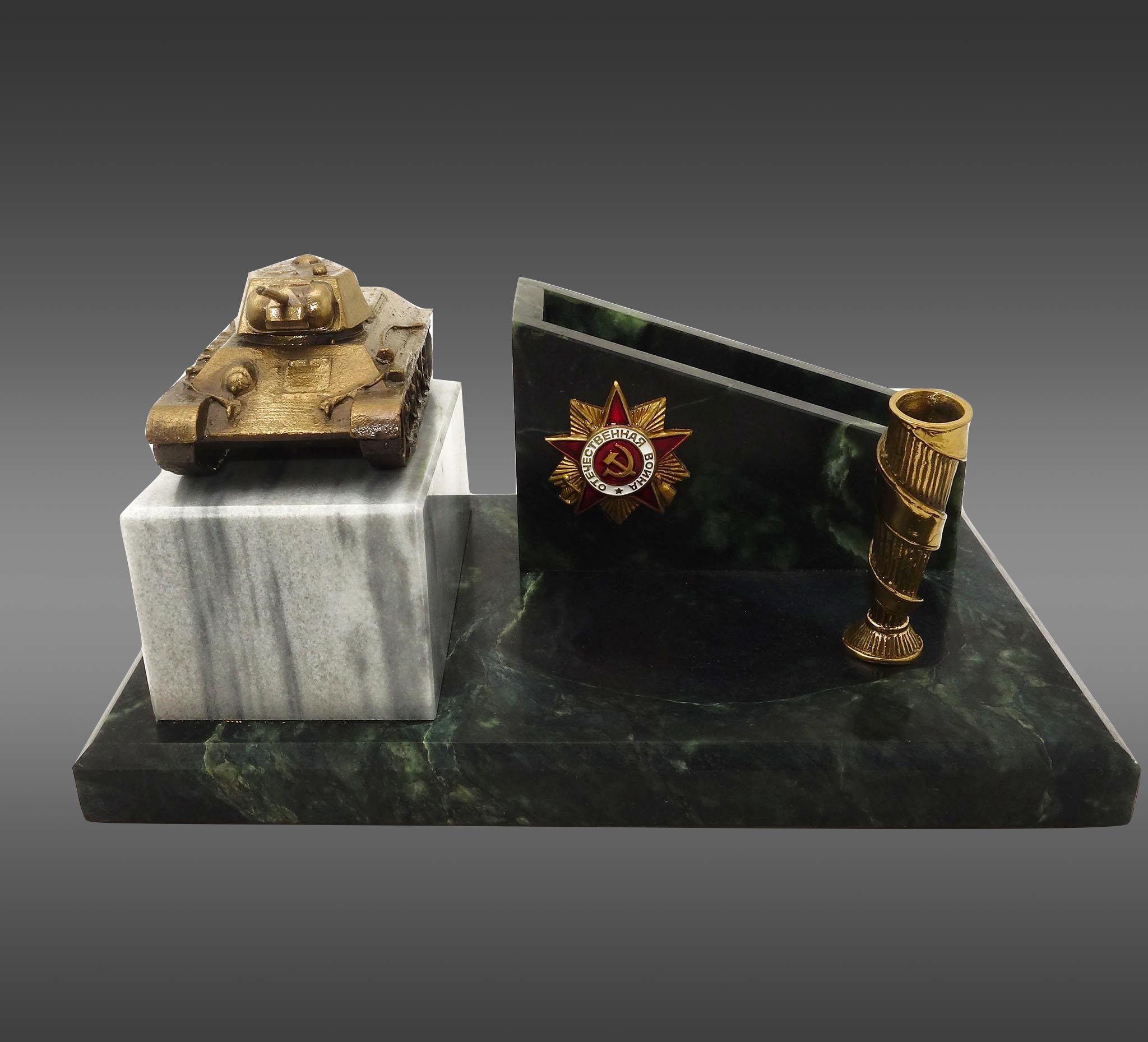 Редкое и уникальное стилизованное дополнение к рабочему столу. Выражайте свою индивидуальность и любовь к отечественной истории с помощью нашего бронзового письменного прибора Танк Т-34. Подарок, который сочетает в себе великую эстетику и функциональность, собранный от классического металла и стальной прочностью. Наши скульпторы воплотили в жизнь бронзовую миниатюру величайшего боевого танка Великой Отечественной войны.