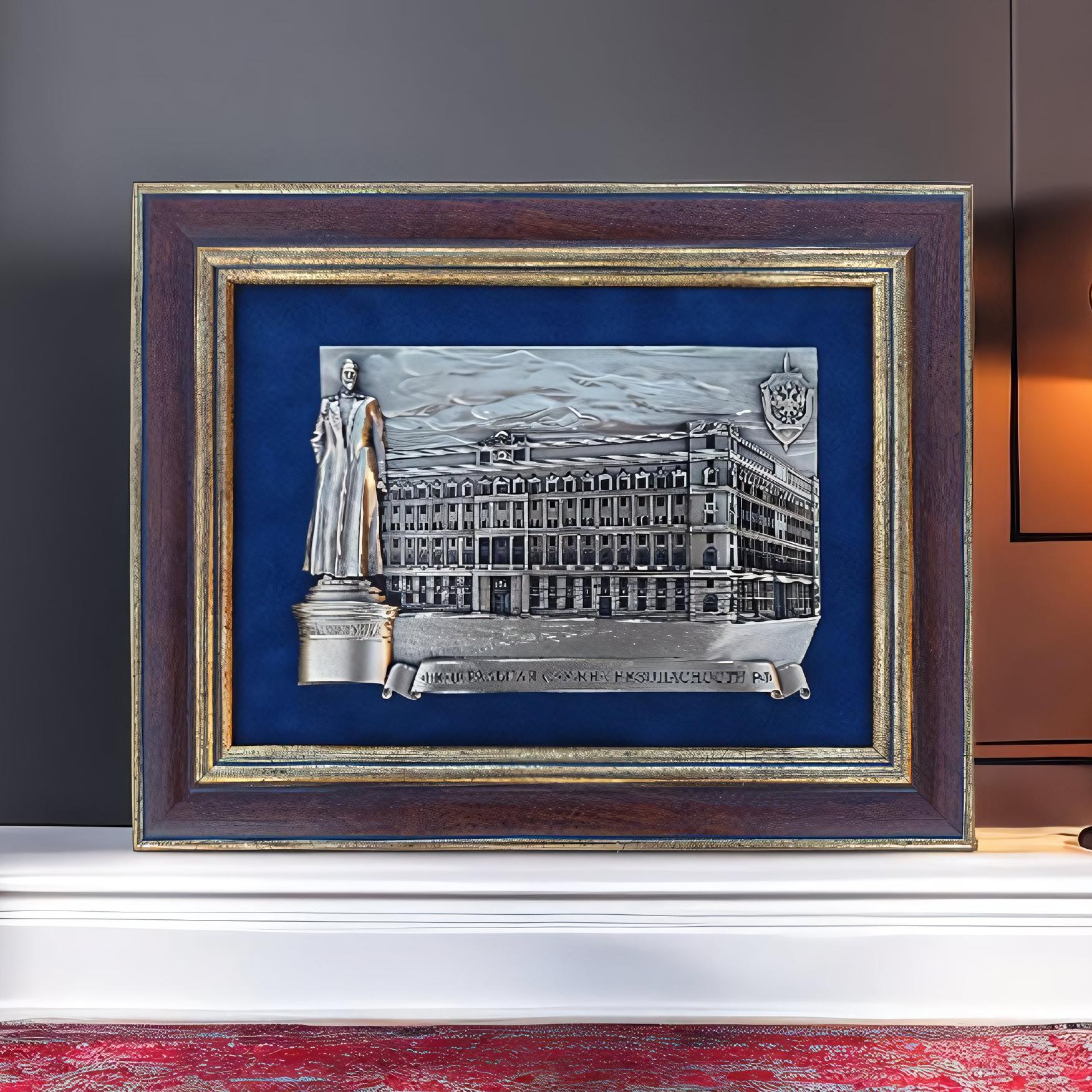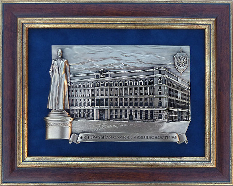 Плакетка с изображением здания и эмблемы Федеральной службы безопасности РФ выполнена вручную. Для изготовления сувенира использованы высококачественные материалы. На бархатном паспарту синего цвета можно увидеть геральдический знак ФСБ. Данный элемент – медный, объемный. Точность и проработанность всех деталей достигается благодаря применению метода гальванопластики.
