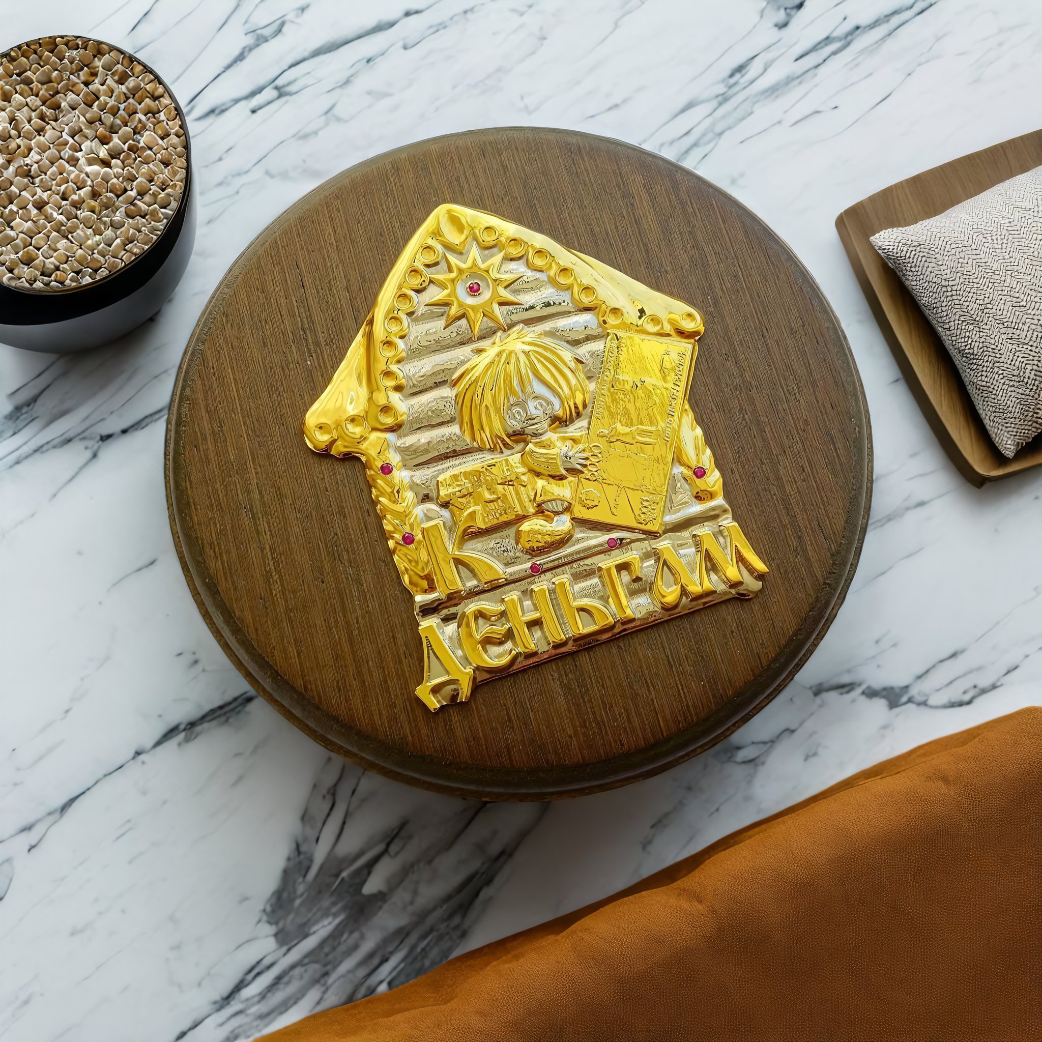 В центре изделия — надпись К деньгам. Это оригинальный и креативный способ заявить о своих финансовых целях и притягательности к благосостоянию. Особый шарм плакетке придает изображение дома из русских сказок. Это символ уюта, комфорта и высоких стремлений, а также отсылка к нашим корням и традициям. |