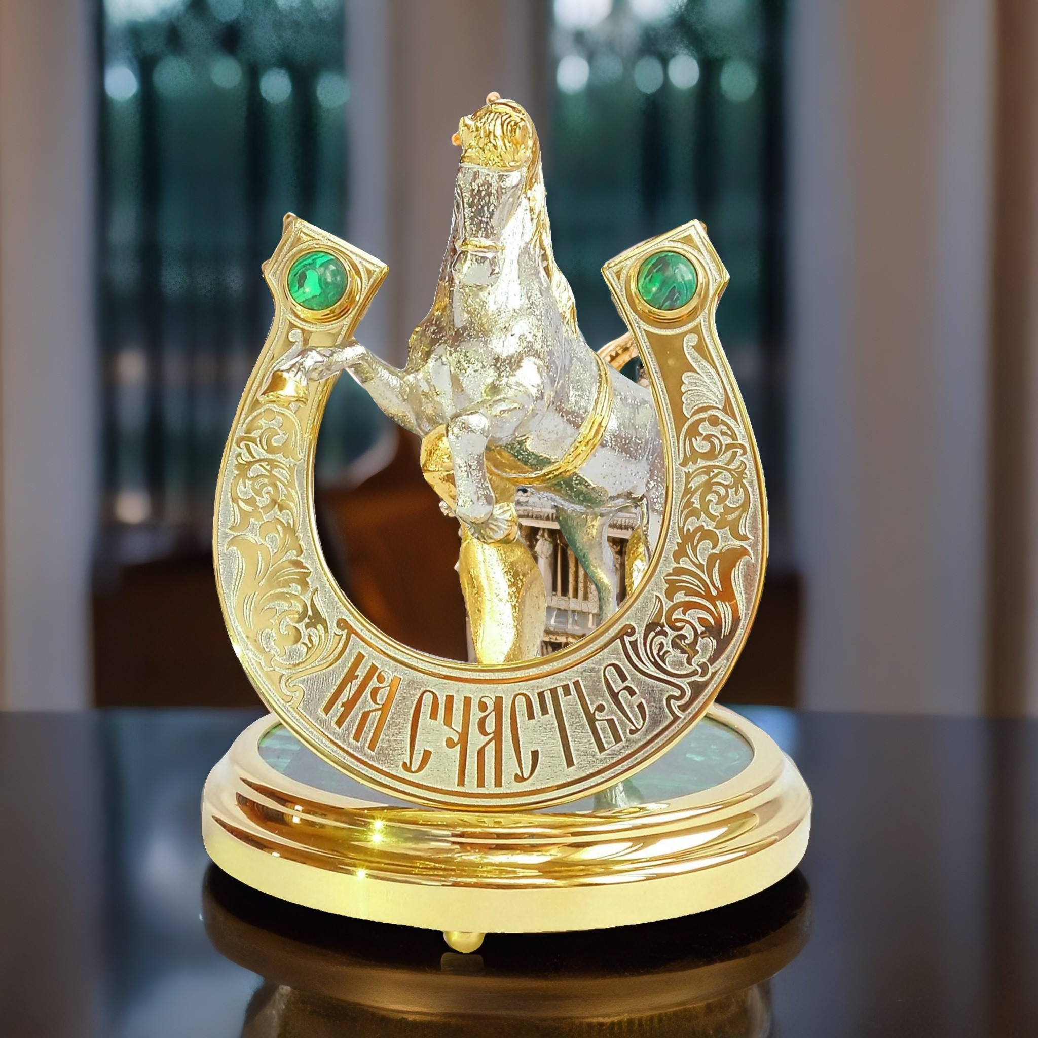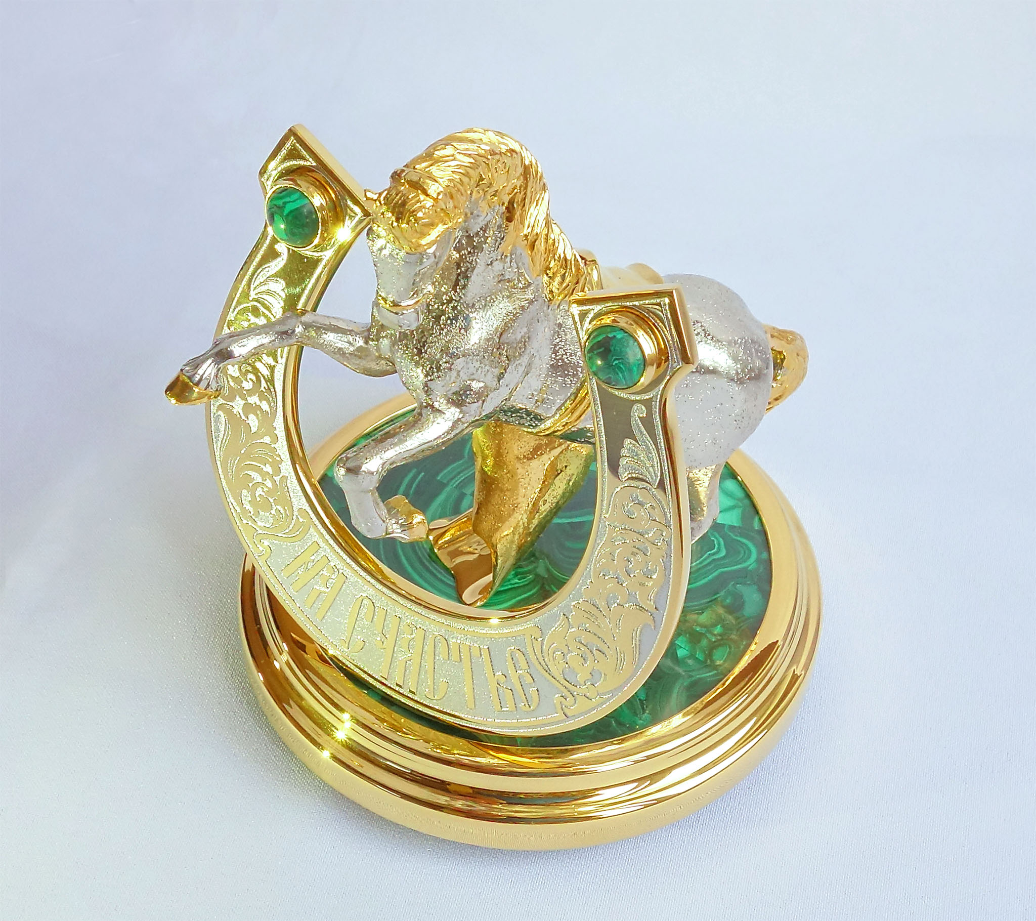 Подкова на счастье "Малахит" из Златоуста - это уникальный и оригинальный подарок, который украсит любой интерьер. Статуэтка коня из подковы укреплена на основании из натурального малахита, что придает ей особую изящность и шарм. Подкова считается талисманом, приносящим удачу и счастье, а конь символизирует силу, свободу и движение вперед. Этот подарок будет идеальным для тех, кто ценит искусство, качество и оригинальность. |