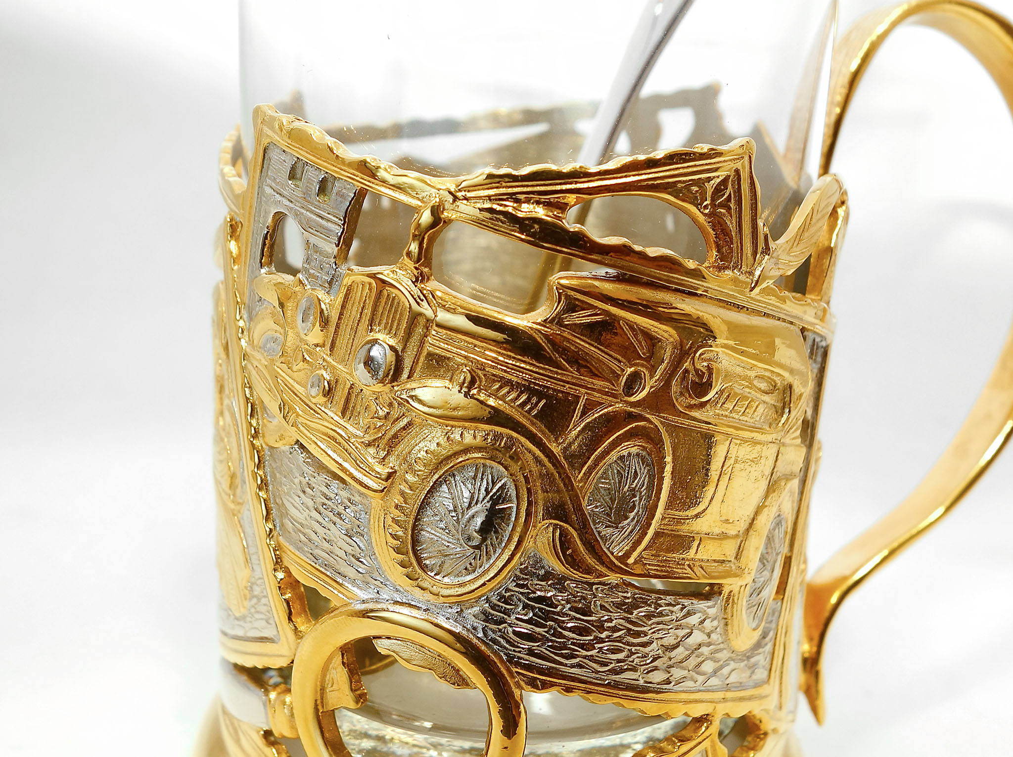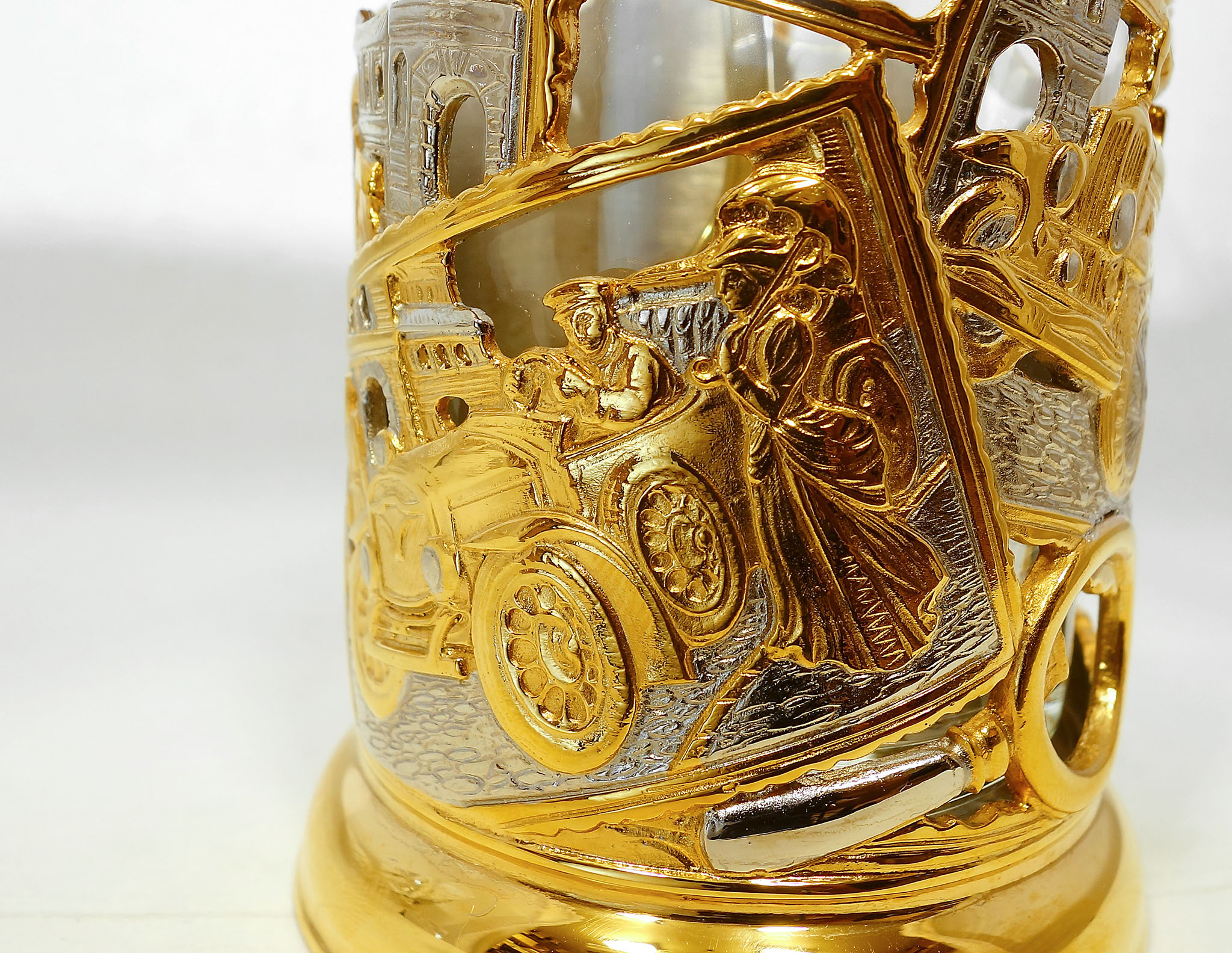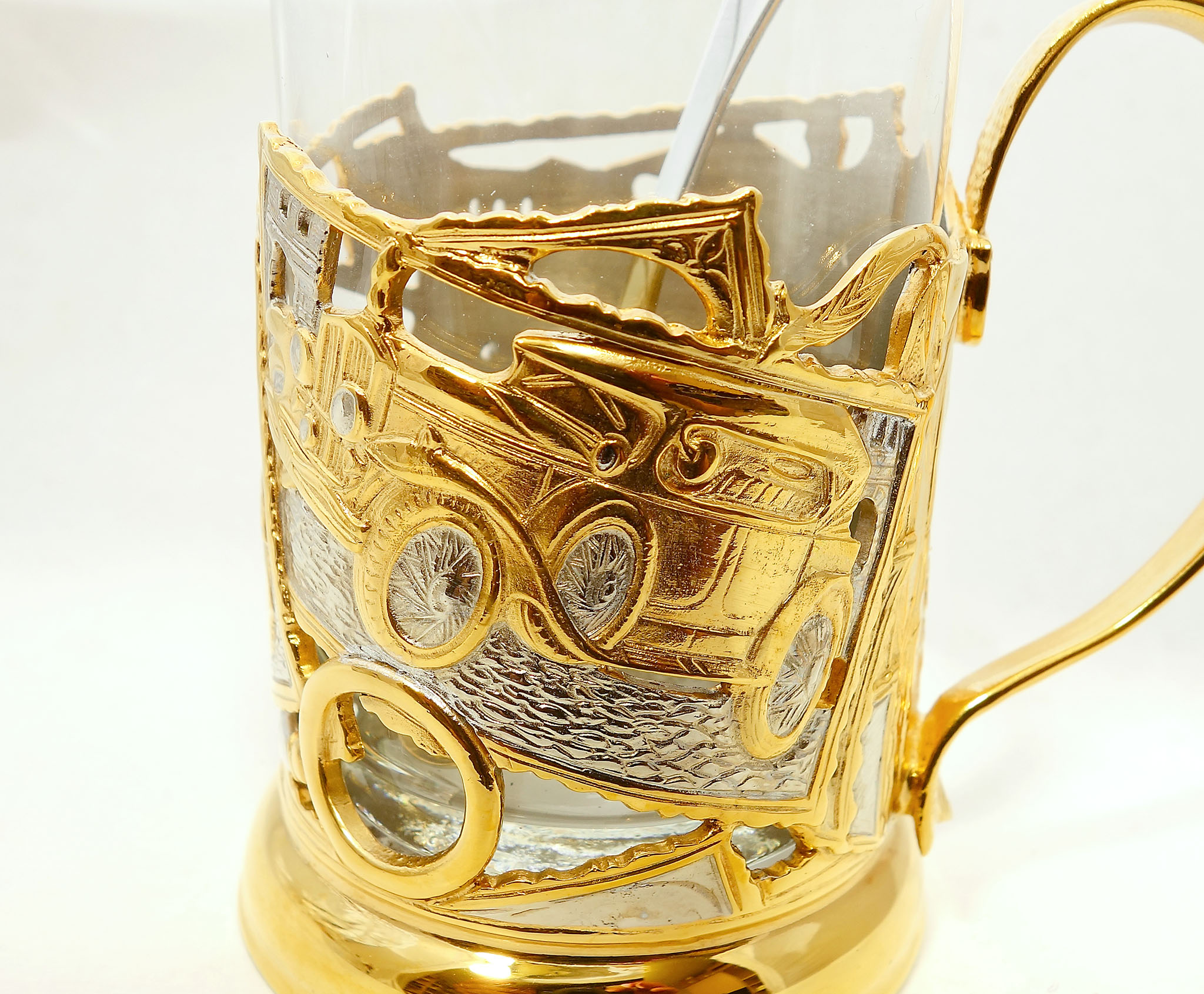 Подстаканник "Ретро" украшен изображениями старинных автомобилей и является прекрасным подарком для любителей классического автомобилестроения. Восхитительные детали и тщательно прорисованные элементы создают уникальную атмосферу прошлого столетия, переносящую в эпоху зари автомобильной промышленности. Этот подстаканник будет великолепным дополнением к коллекции любителя старинных автомобилей или же станет необычным и запоминающимся подарком для всех, кто увлекается историей автомобилестроения. |