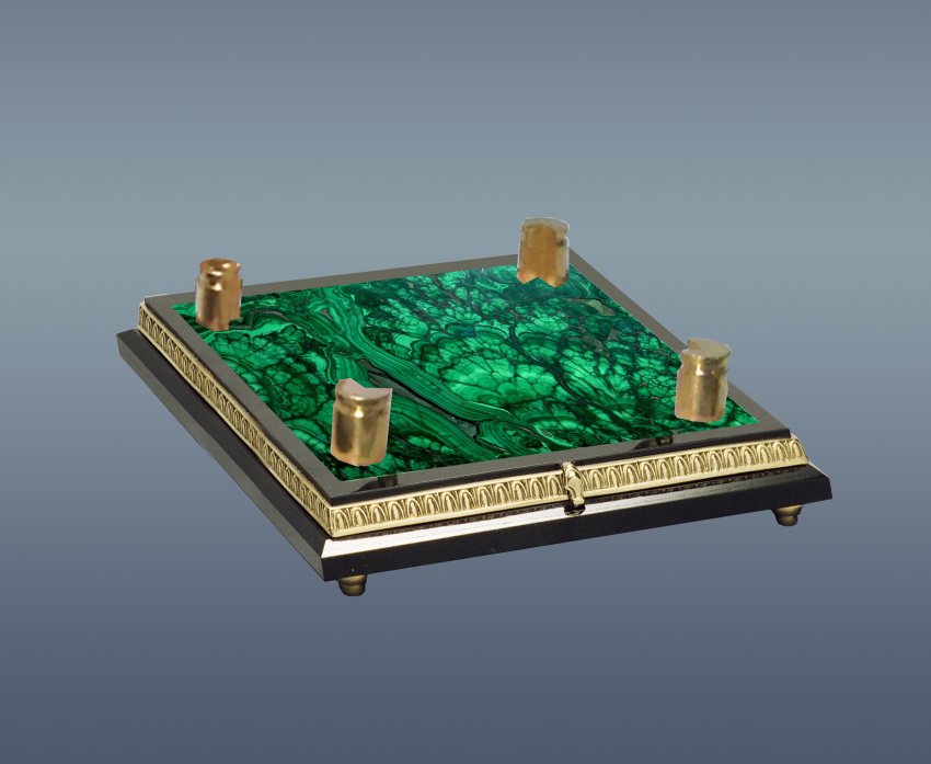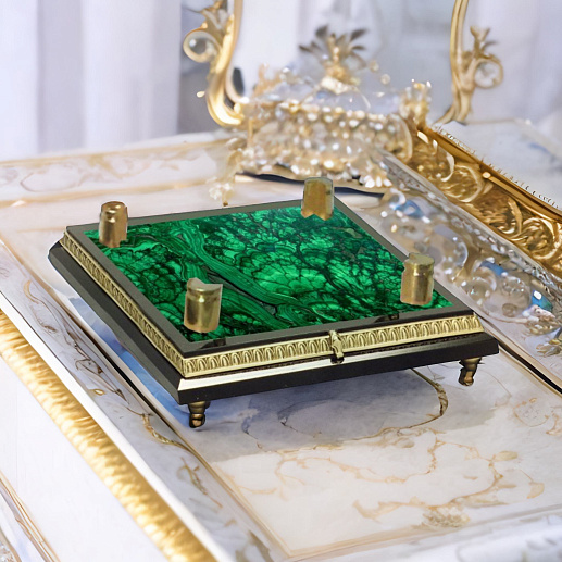 Сияние бронзы, придающее ей величие, усилено золочением, совершенствуя образ. Историю камня с его уникальными узорами накладывается на тепло бронзы, создавая баланс между природной эстетикой и классическим изяществом. Наша подставка под бумаги из малахита не только обеспечивает удобное хранение ваших документов, но и станет центральным элементом декора вашего рабочего места. |