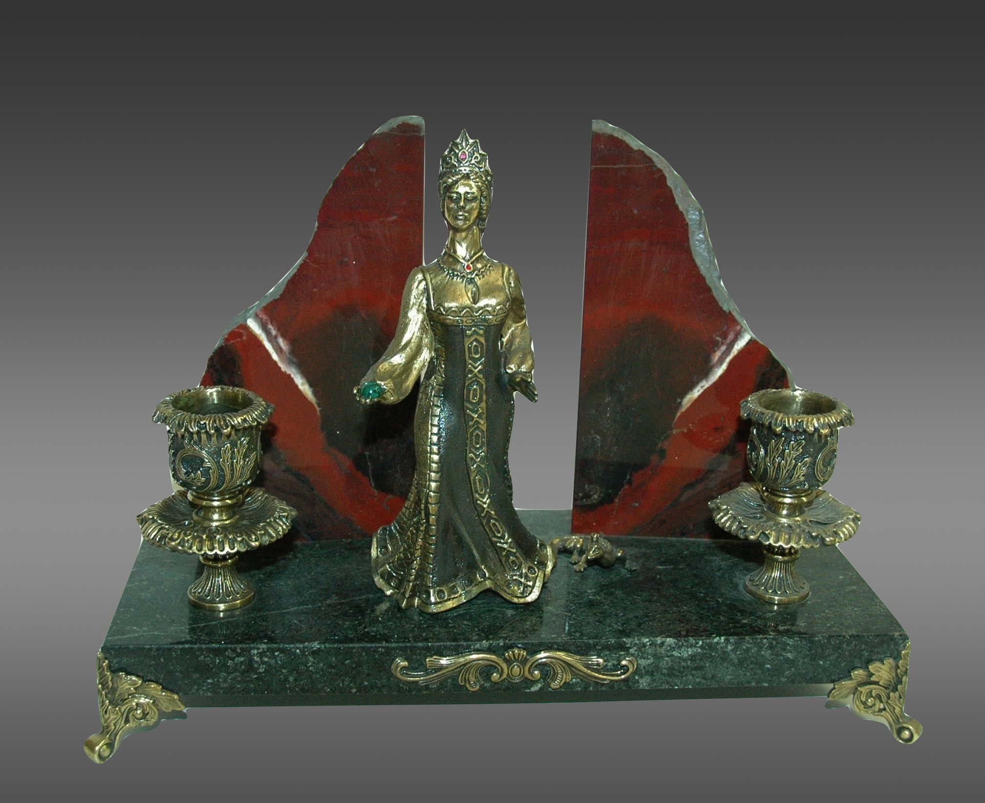 Встречайте: дизайнерский подсвечник для двух свечей! Особенностью этого изделия является бронзовая статуэтка хозяйки медной горы в основании — элегантный и оригинальный акцент, который не оставит равнодушными ваших гостей. Материал основания — змеевик придает каждому экземпляру уникальность, а также делает устройство более устойчивым и долговечным. Гарантия долгой службы и высокого качества. «Шедевр искусства и практичный предмет интерьера в одной упаковке! Не упустите свой шанс стать обладателем этого великолепного подсвечника.» Ваш интерьер засияет новыми красками благодаря этим маленьким огням, скромно горящем в нашем дизайнерском подсвечнике. |