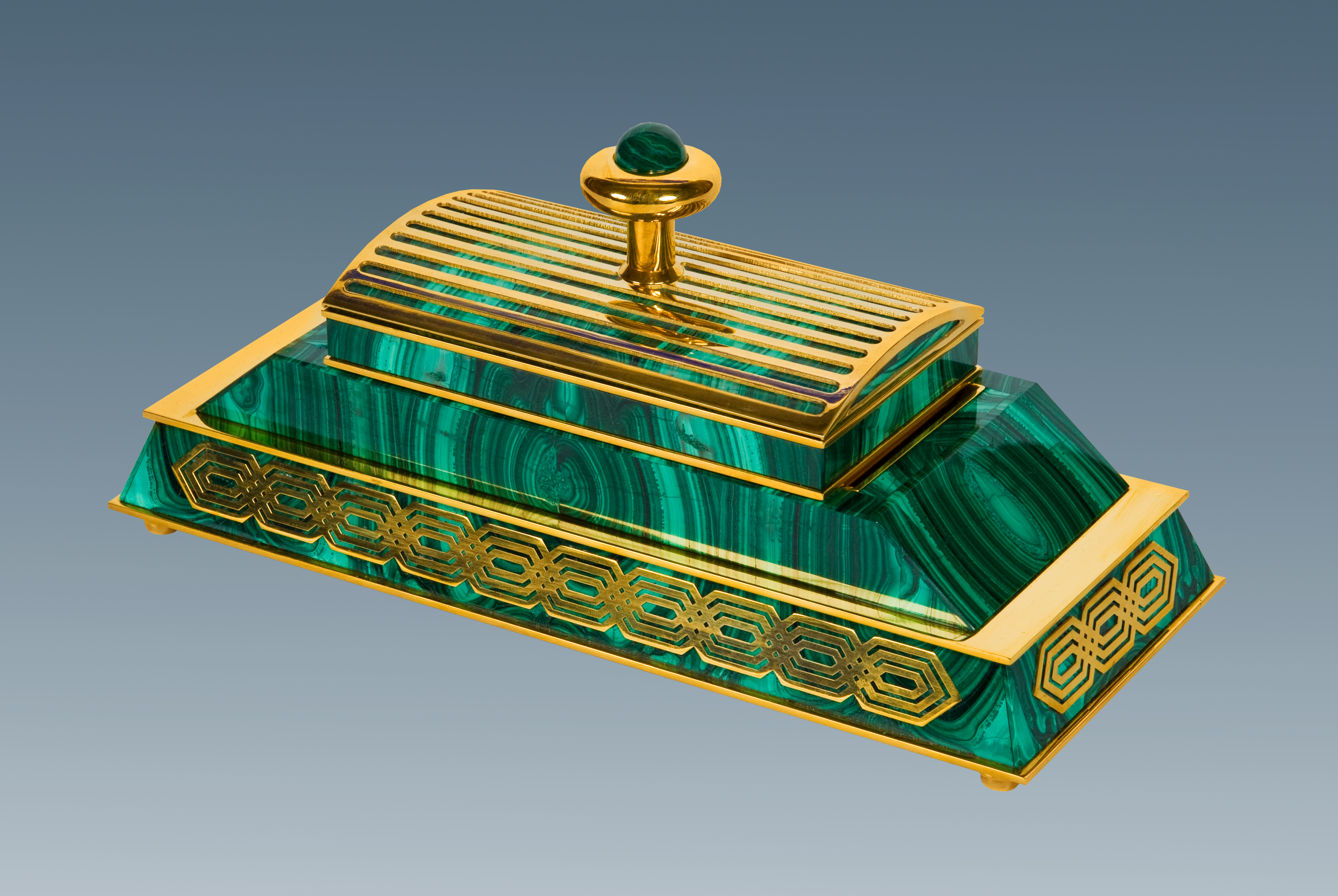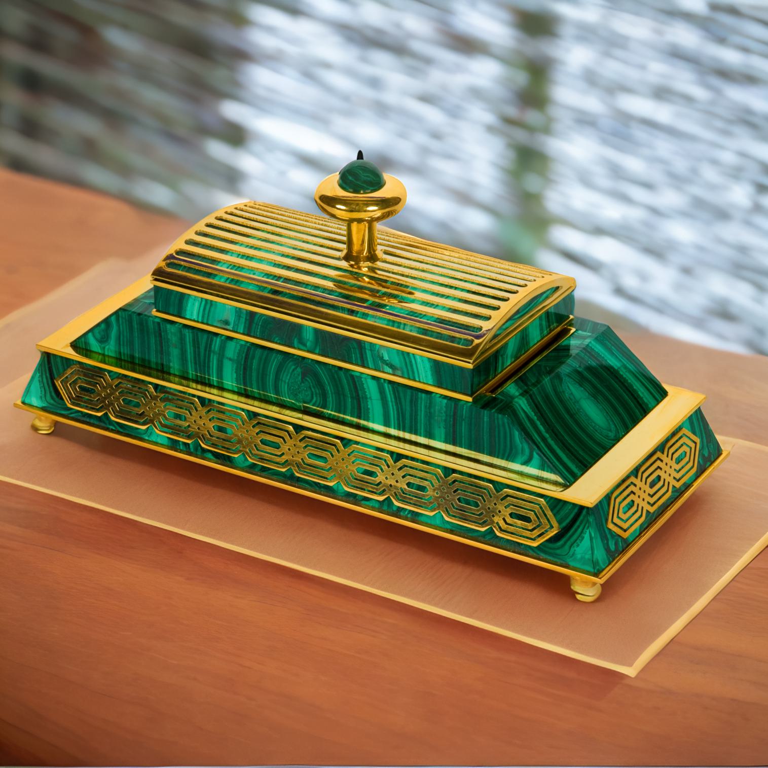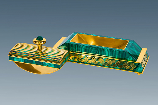 Уникальное произведение искусства и практичный предмет для Вашего рабочего стола — пресс-папье на подставке, выполненной из натурального малахита, долерита и позолоченной бронзы. Это настоящее украшение для любого офисного или домашнего интерьера. Малахит и долерит дополняют друг друга гармонично, создавая интересный контраст между теплыми и холодными оттенками камня. При этом позолоченная бронза подчеркивает роскошь и богатство изделия.