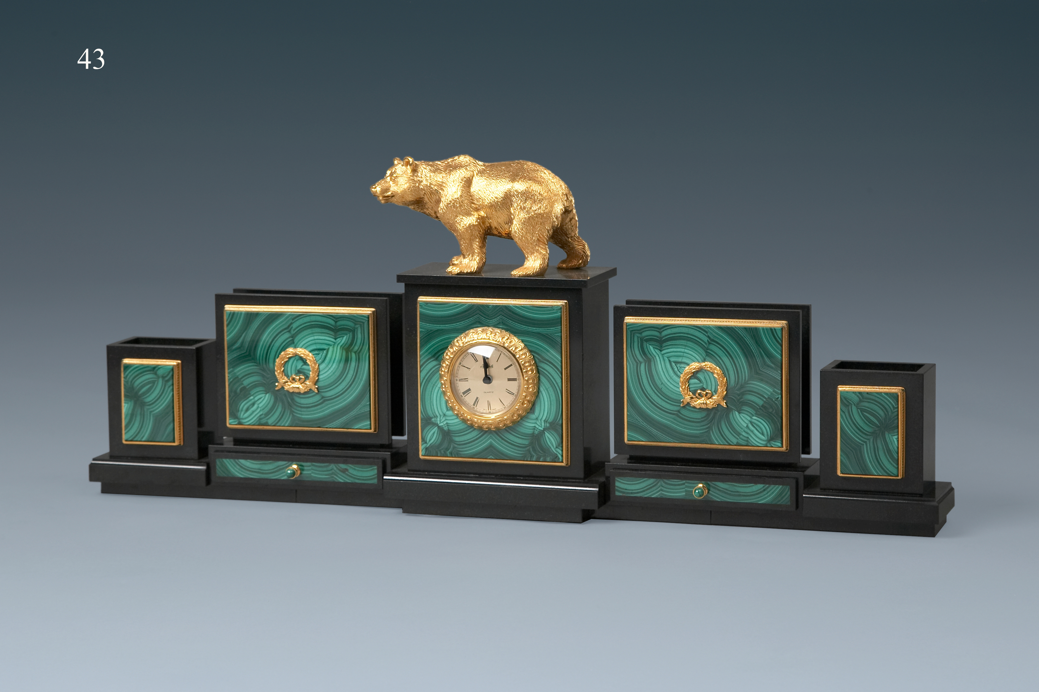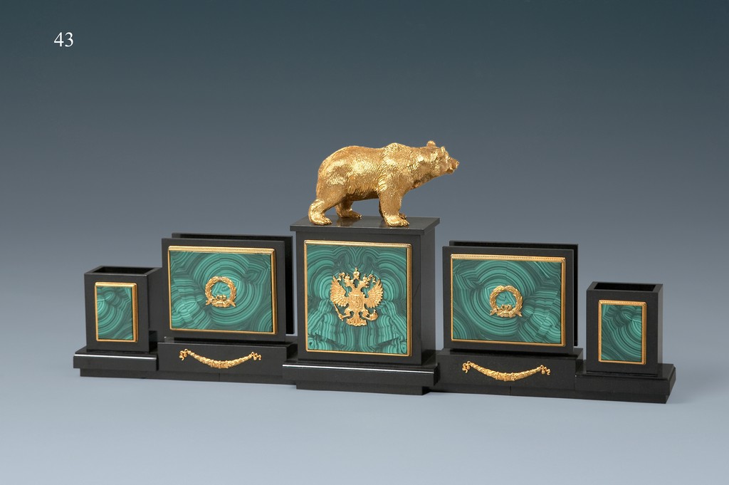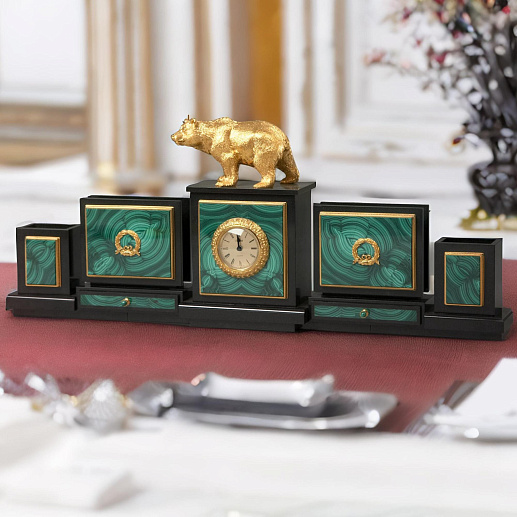«Медведь» не только справляется со своими прямыми обязанностями, но и является изящной декорацией. Ведь он состоит из стильной визитницы, удобных подставок для карандашей, часов и, конечно, статуэтки медведя, которая выполнена из позолоченной бронзы.