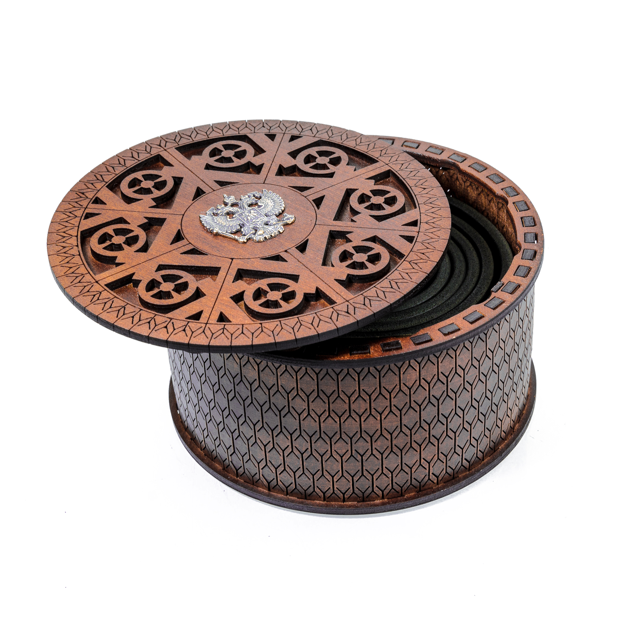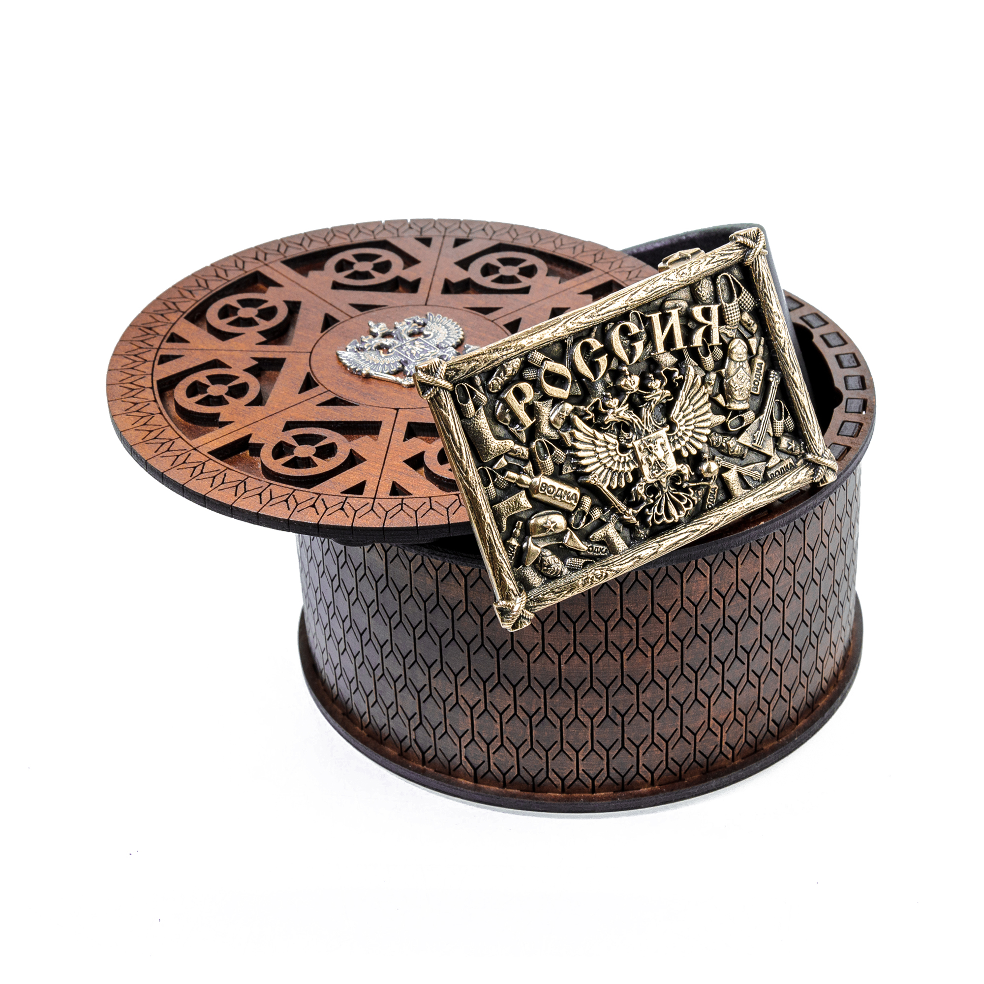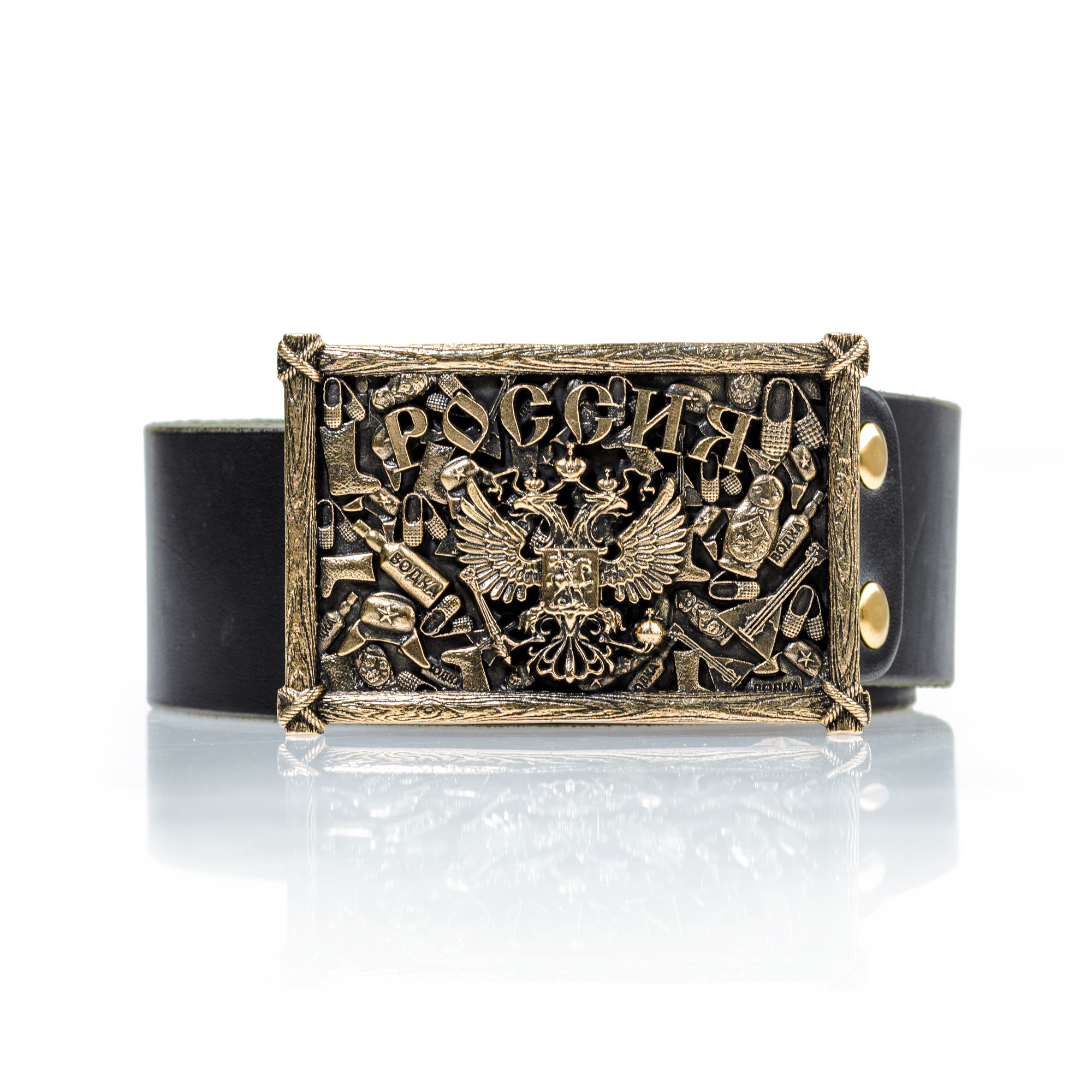 Ремень из натуральной кожи высокого качества с пряжкой, на которой изображен герб Российской Федерации на фоне лаптей, балалаек, шапок ушанок - основных стереотипов, вызывающих у многих иностранных гостей ассоциации с Россией. Пряжку украшает рамка, имитирующая связанные между собой деревянные доски. Ремень придется по вкусу любителям подобной тематики, коллекционерам и людям с хорошим чувством юмора. |