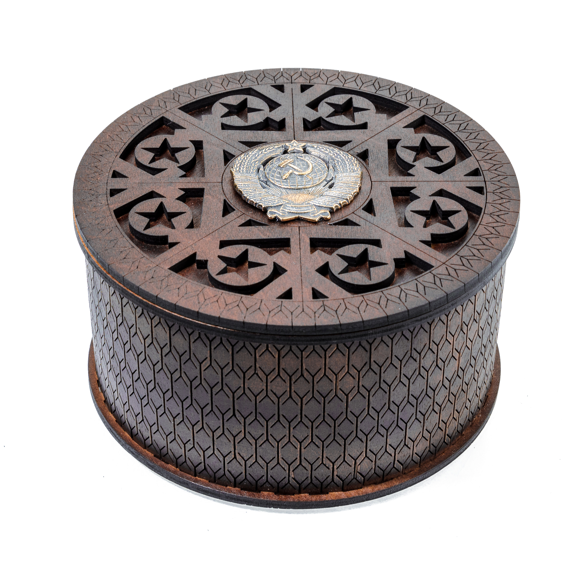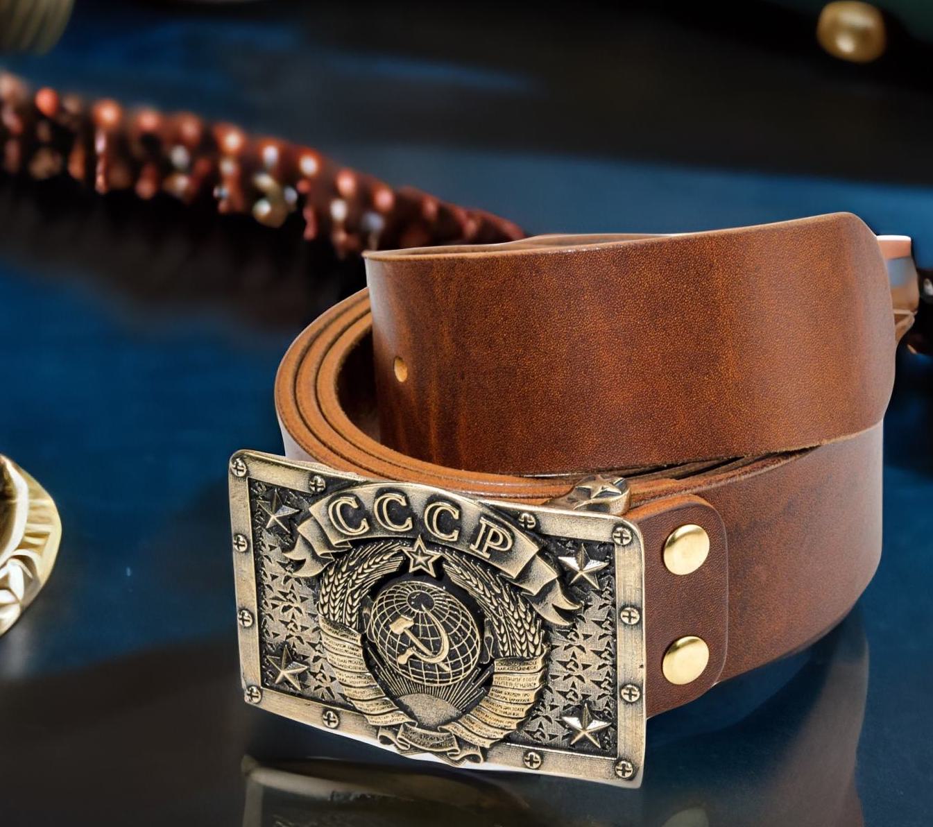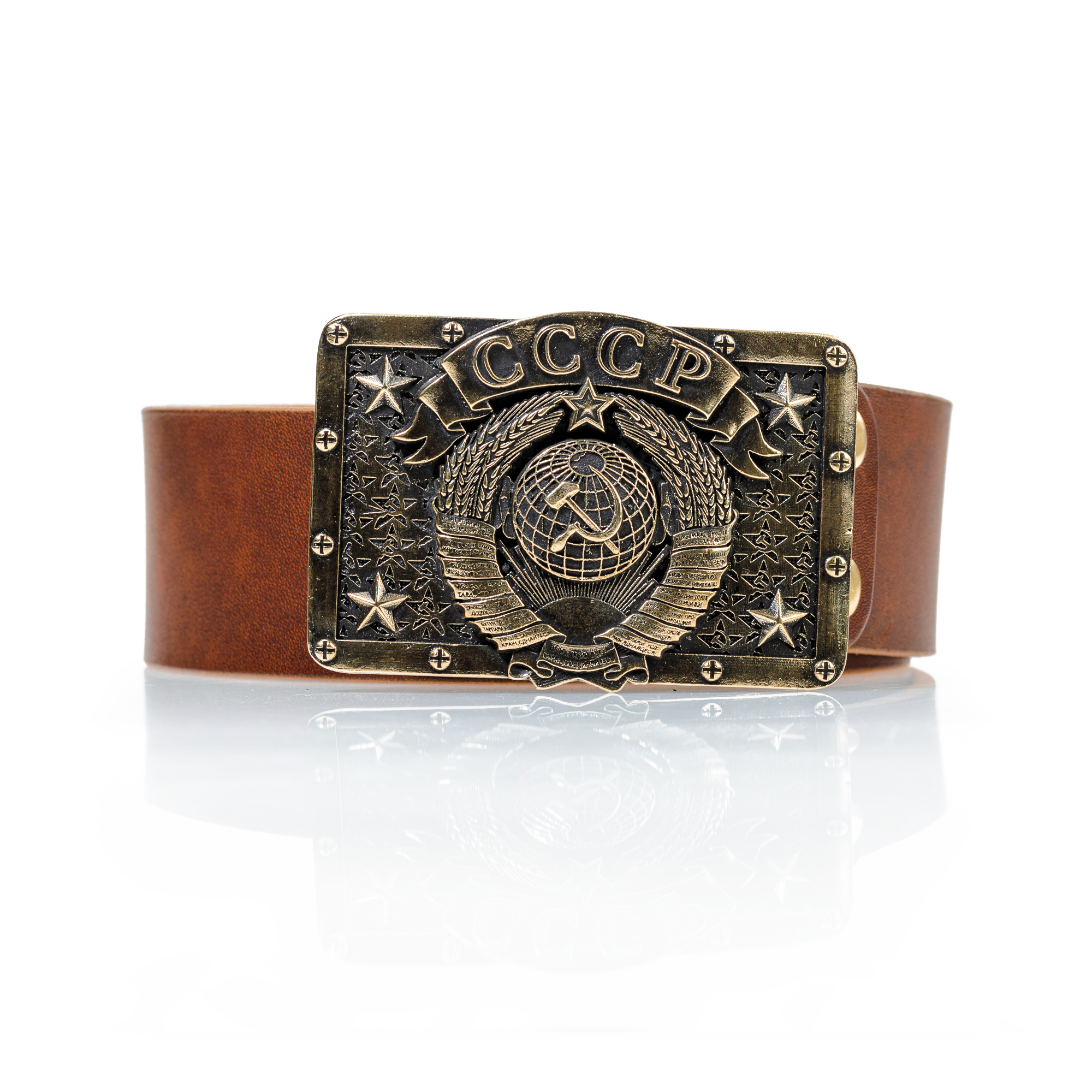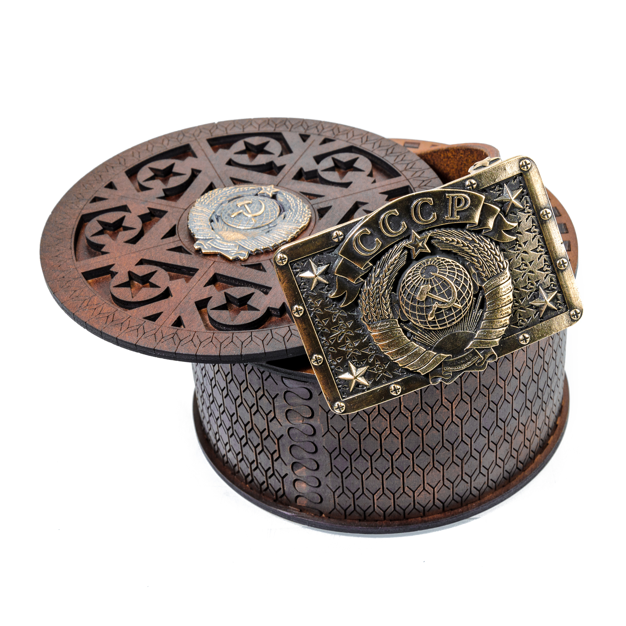 Ремень из натуральной кожи высокого качества с пряжкой, на которой изображен герб СССР на фоне звезд с серпами и молотами. Ремень послужит прекрасным подарком любителям подобной тематики и коллекционерам, а, идущая в комплекте, резная коробка сделает подарок еще более статусным. |
