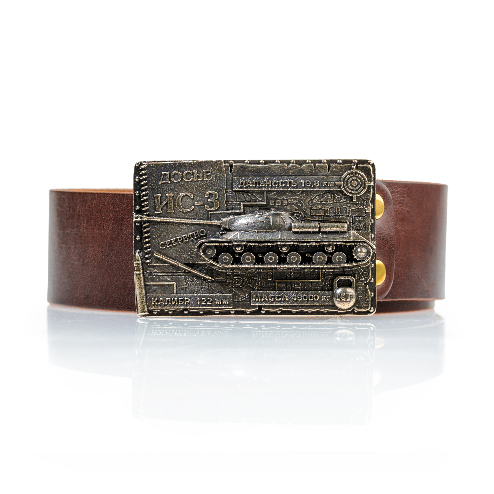 Ремень из натуральной кожи высокого качества с пряжкой, на которой изображен советский тяжелый танк ИС-3 с некоторыми техническими характеристиками на фоне прикрепленного секретного досье. Из-за необычной формы лобовой части корпуса танк получил негласное название "щука". Основными достоинствами танка являлись мощная дифференцированная броневая защита и внушительное вооружение. Ремень станет замечательным и оригинальным подарком увлеченному коллекционеру и любителю военной тематики. |