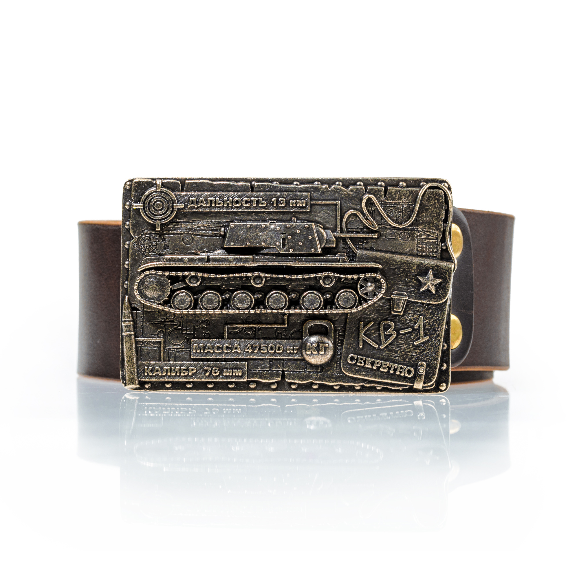 Ремень из натуральной кожи высокого качества с пряжкой, на которой изображен танк КВ-1 с некоторыми техническими характеристиками на фоне сумки с секретными документами. Танк КВ-1 по праву признан одним из символов победы в Великой Отечественной Войне наряду с легендарным Т-34 и был практически неуязвимым для немецких орудий. Ремень послужит прекрасным подарком увлеченному коллекционеру и любителю военной тематики. |