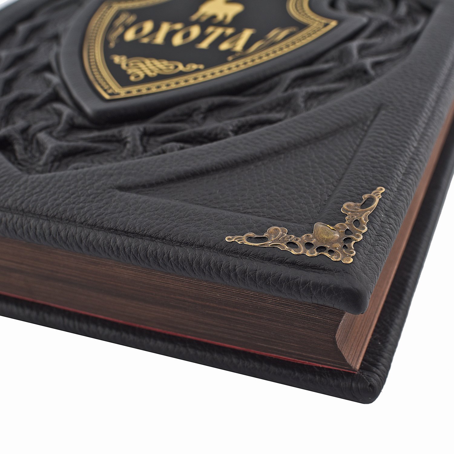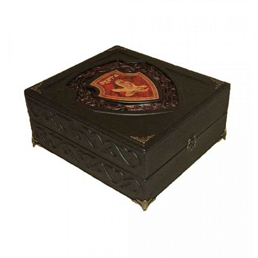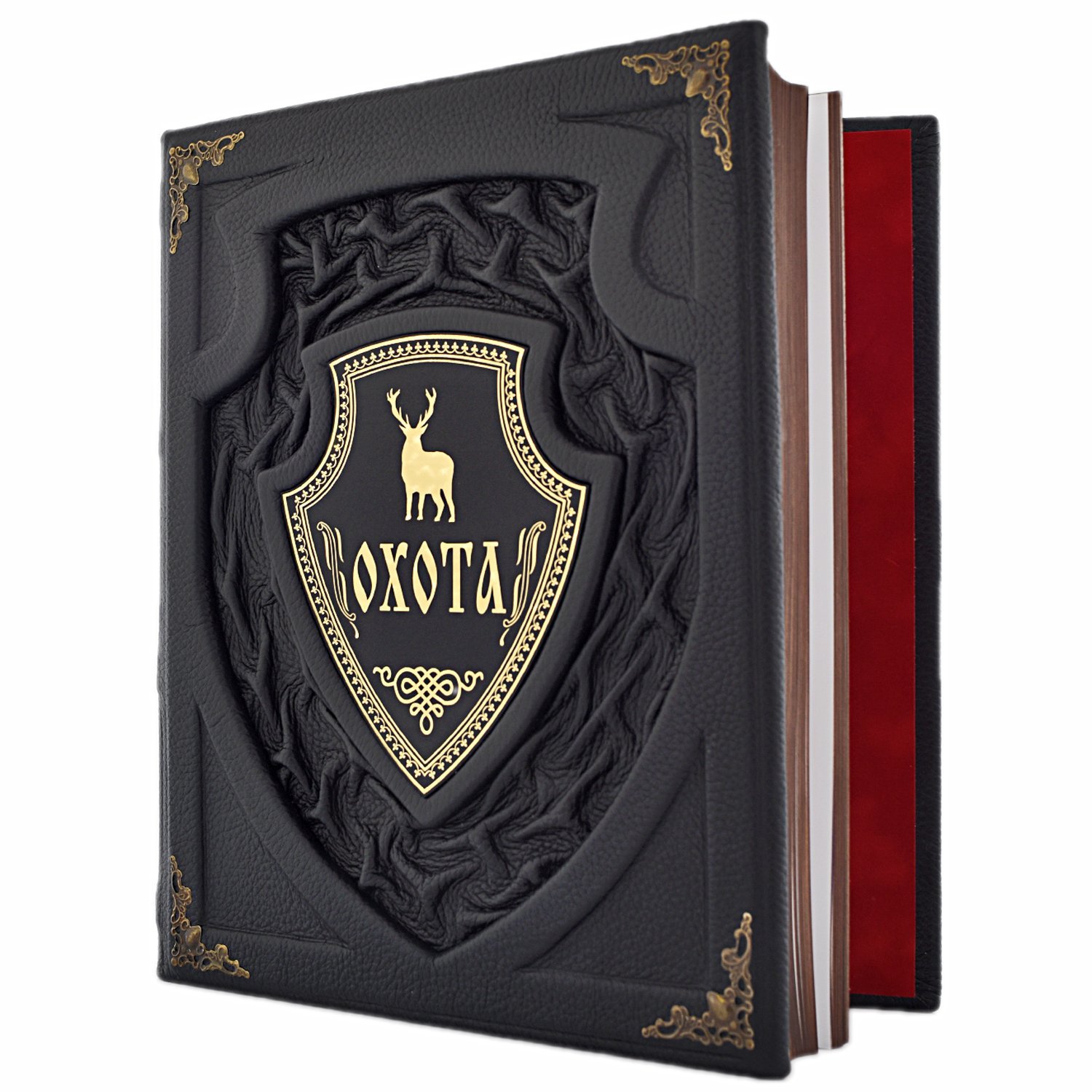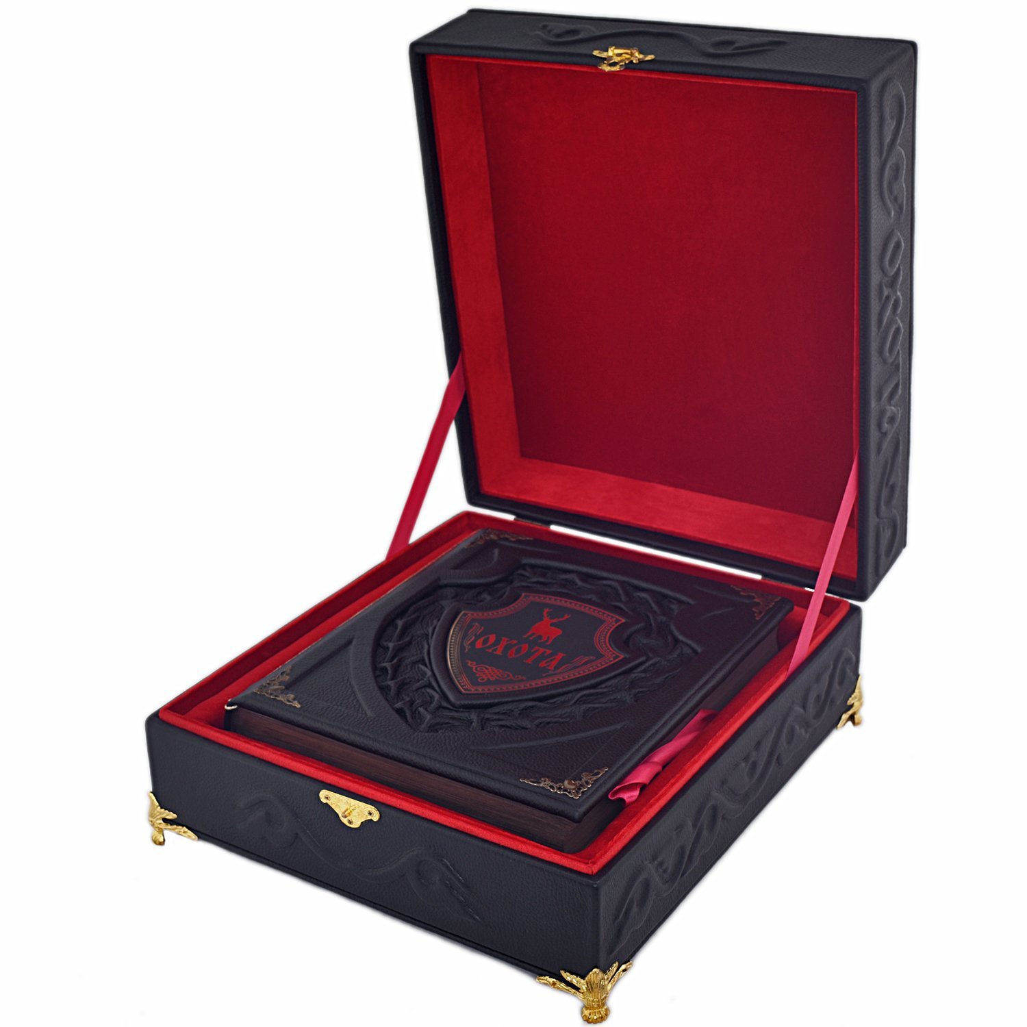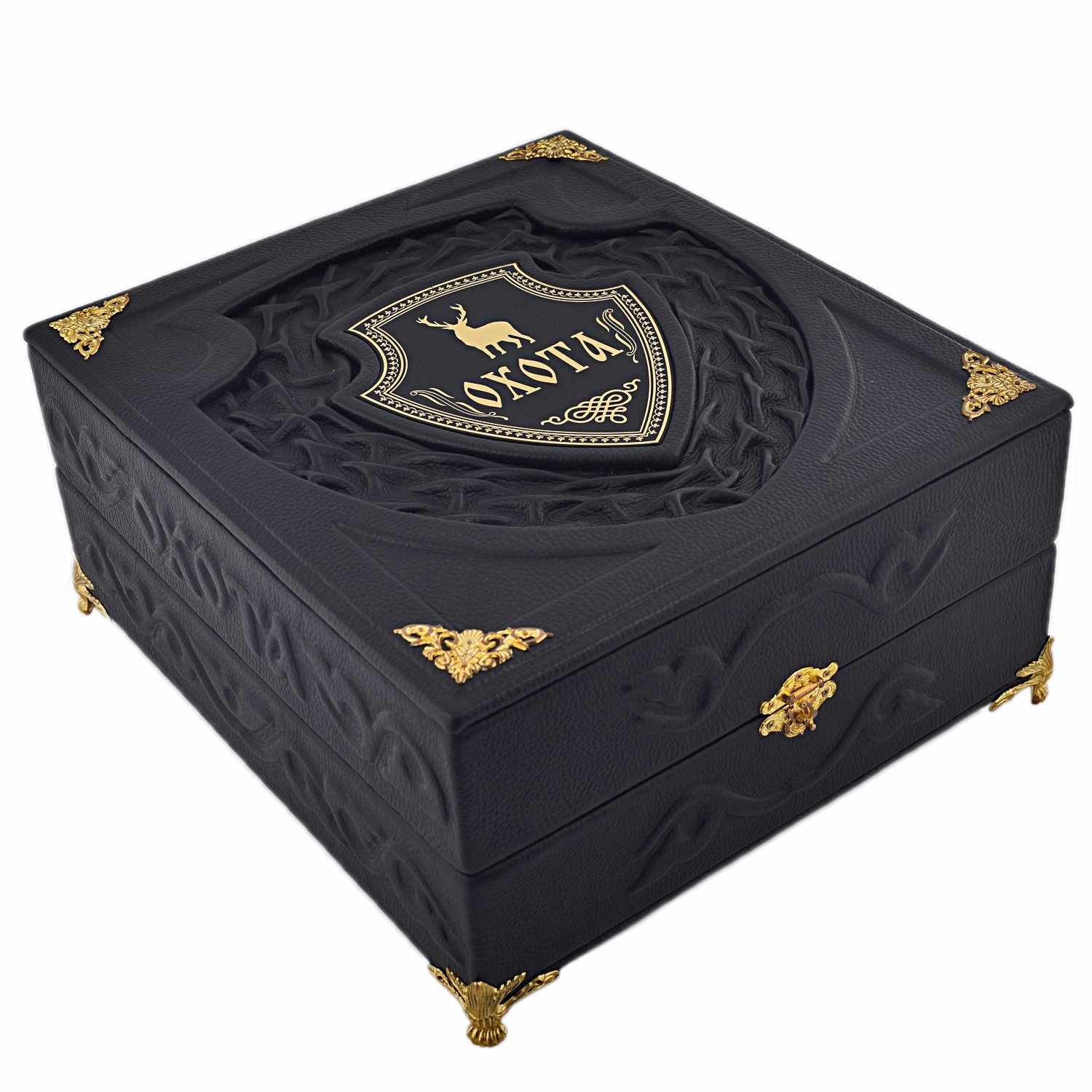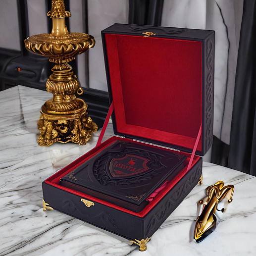 Такое издание не стыдно преподнести в качестве подарка любому, даже человеку высокого статуса. Ручная работа не имеет равных себе и это прослеживается в каждой мелочи. Центральный элемент и тиснение повторяется на издании и на коробе создавая ощущение единства композиции. Они делают такую выделку особенно богатой, по-королевски шикарной, изумительной. Четыре тома книги «Великокняжеская, царская и императорская охота на Руси» представлены на страницах представленного изделия. Н.И. Кутепов провел колоссальную работу, которая была переиздана в коллекционном виде. Текст написан в соответствии с нормами современного русского языка, поэтому книга рассчитана на широкий круг читателей. Более пятисот иллюстраций стали идеальным дополнением к полезной исторической выжимке. Это ценный источник данных о культуре охоты и быте страны с древних времен и до 19 века. Короб изготавливается из той же дорогой импортной кожи, что и обложка книги. Такой подарок достоин стать жемчужиной фамильной коллекции книг. Шкатулка будет надежно оберегать страницы от негативного влияния пыли и времени. Приобретая изделие в коробе вы получаете нечто большее, чем просто книгу. Классическая техника выделки кожи делает работу уникальной и неповторимой, создаваемая по авторскому эскизу она стала эталоном лучшего подарка. Короб: Накладка - гравировка на металле . Уголки , замок , ножки - металл особого сплава Книга: Накладка - гравировка на металле |