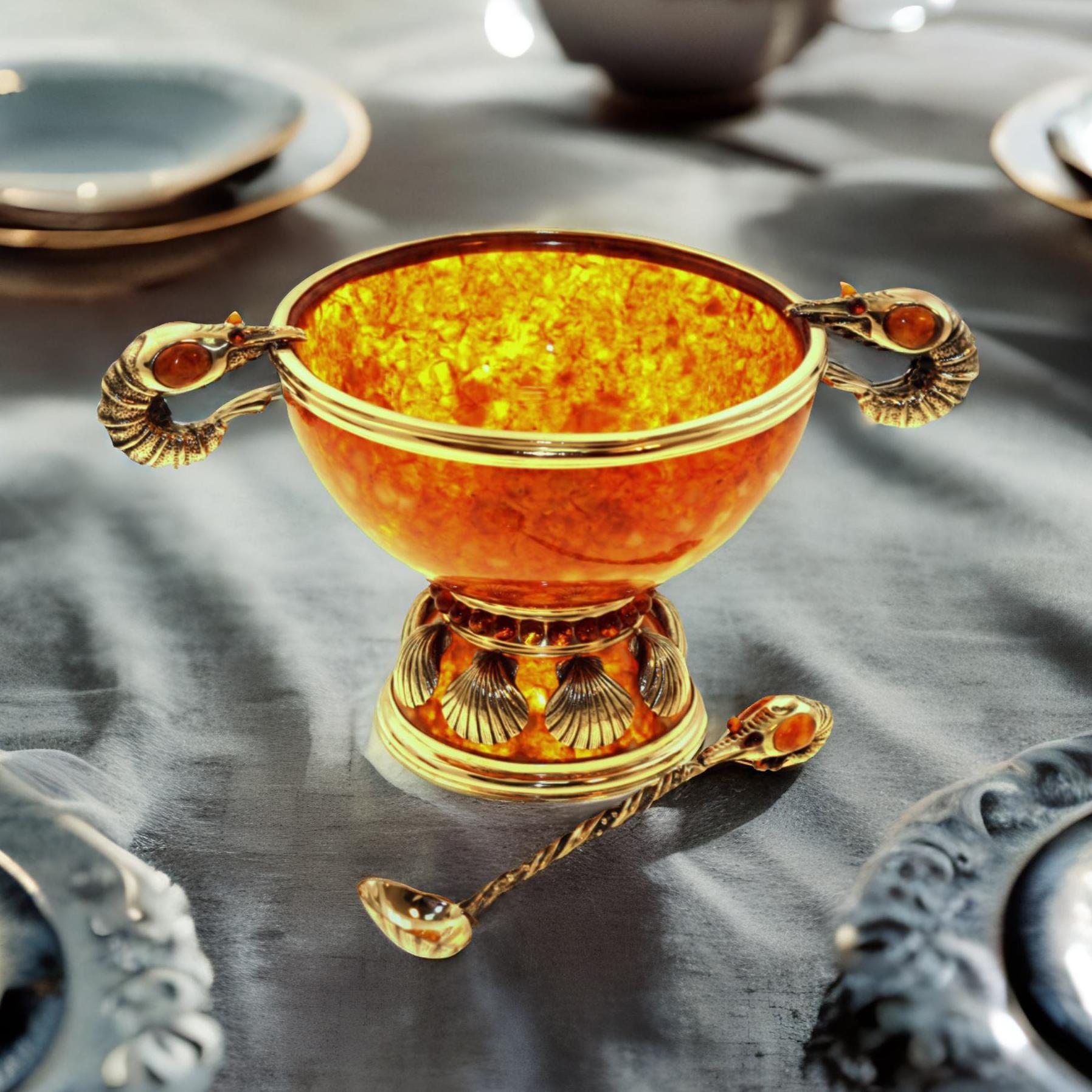 Уникальная сувенирная салатница из янтаря — это не просто предмет сервировки, это изделие искусства, которое займет почетное место в вашей коллекции. Салатница украшена изысканными бронзовыми элементами, которые подчеркивают естественную красоту натурального янтаря. Желто-оранжевое сияние камня напоминает теплые летние закаты и добавляет уют в любой интерьер. В комплект салатницы входит удобная ложка, также изготовленная из янтаря и украшенная бронзой. Это делает использование салатницы еще более приятным и удобным.