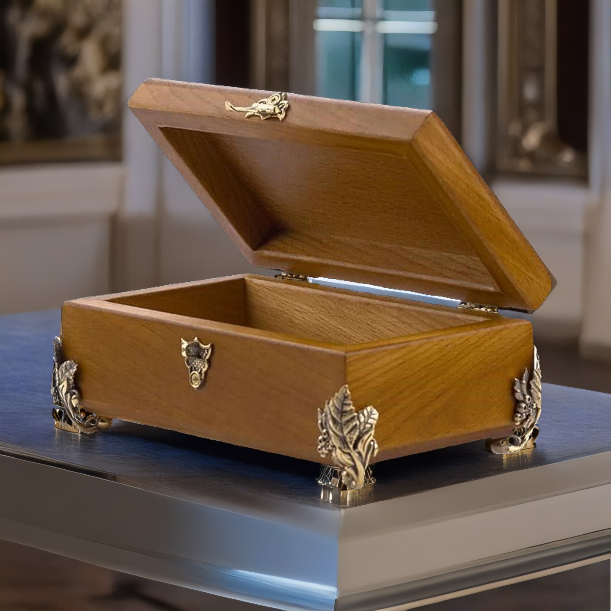 Часто мы сталкиваемся с чувством беспокойства о том, где и как лучше хранить наши драгоценные украшения и мелкие ценные вещи. Но, покупая оригинальную деревянную шкатулку, вы обретаете не только практичное и безопасное место для хранения, но и привлекательный элемент декора. Наша ручная работа – эта деревянная шкатулка обещает долгую службу благодаря своей прочности и качеству. Украшена изысканными бронзовыми элементами, она является образцом стиля и роскоши.