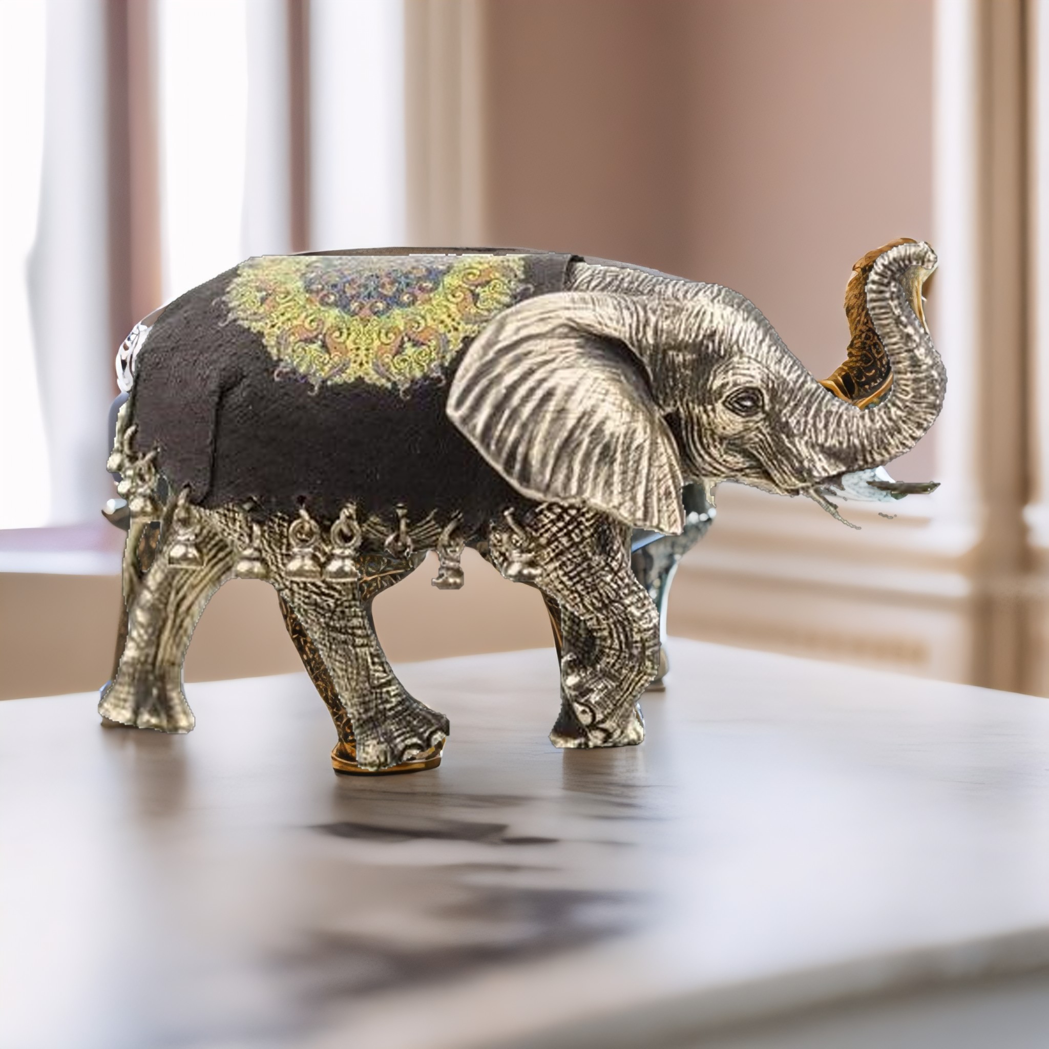 Роскошный слон - символ долголетия и богатства, с помощью потайного замка и резного ключа превращается в удивительную шкатулку уникальным узором внутри, выполненным вручную талантливыми мастерами, который не просто украсит интерьер, но и сохранит какой-нибудь важный секрет своего владельца. Фигурка слона покрыта кожаной попоной с необычным этническим орнаментом, украшенной бронзовыми бусинками, стилизованными под кисточки. Необыкновенная шкатулка с загадкой послужит замечательным подарком на любой праздник и станет впоследствии фамильным раритетом, передаваемым из поколения в поколение. |