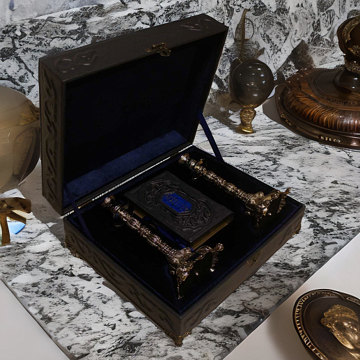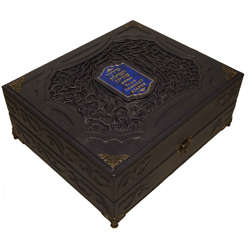 Оформление короба натуральная кожа , бархат . Накладка - гравировка на металле . Уголки , замок , ножки - металл особого сплава