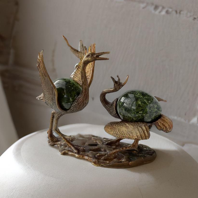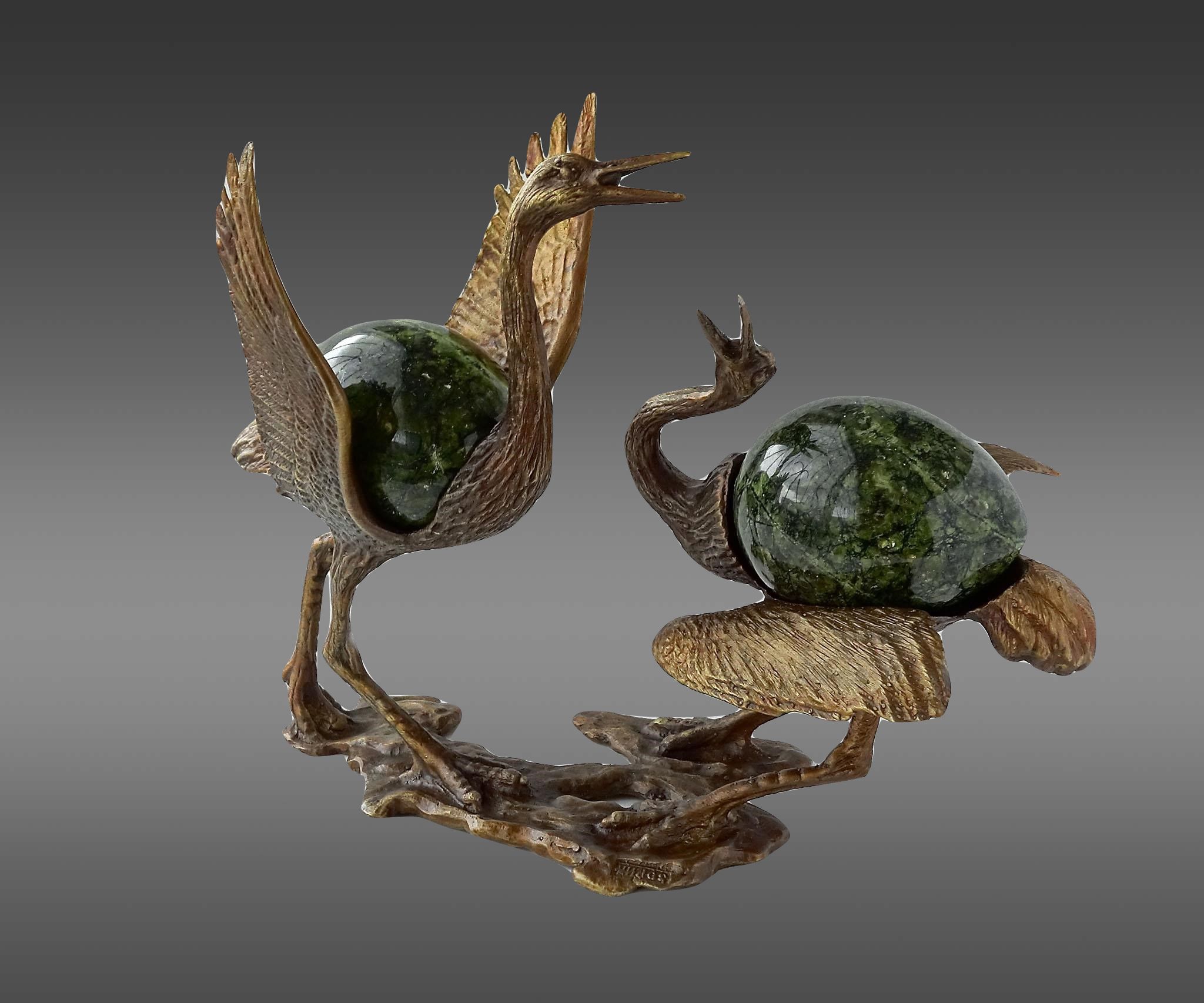«Танцующие журавли» – это скульптура из двух журавлей. Тела журавлей выполнены из змеевика, что придает им уникальный стиль и характер.
