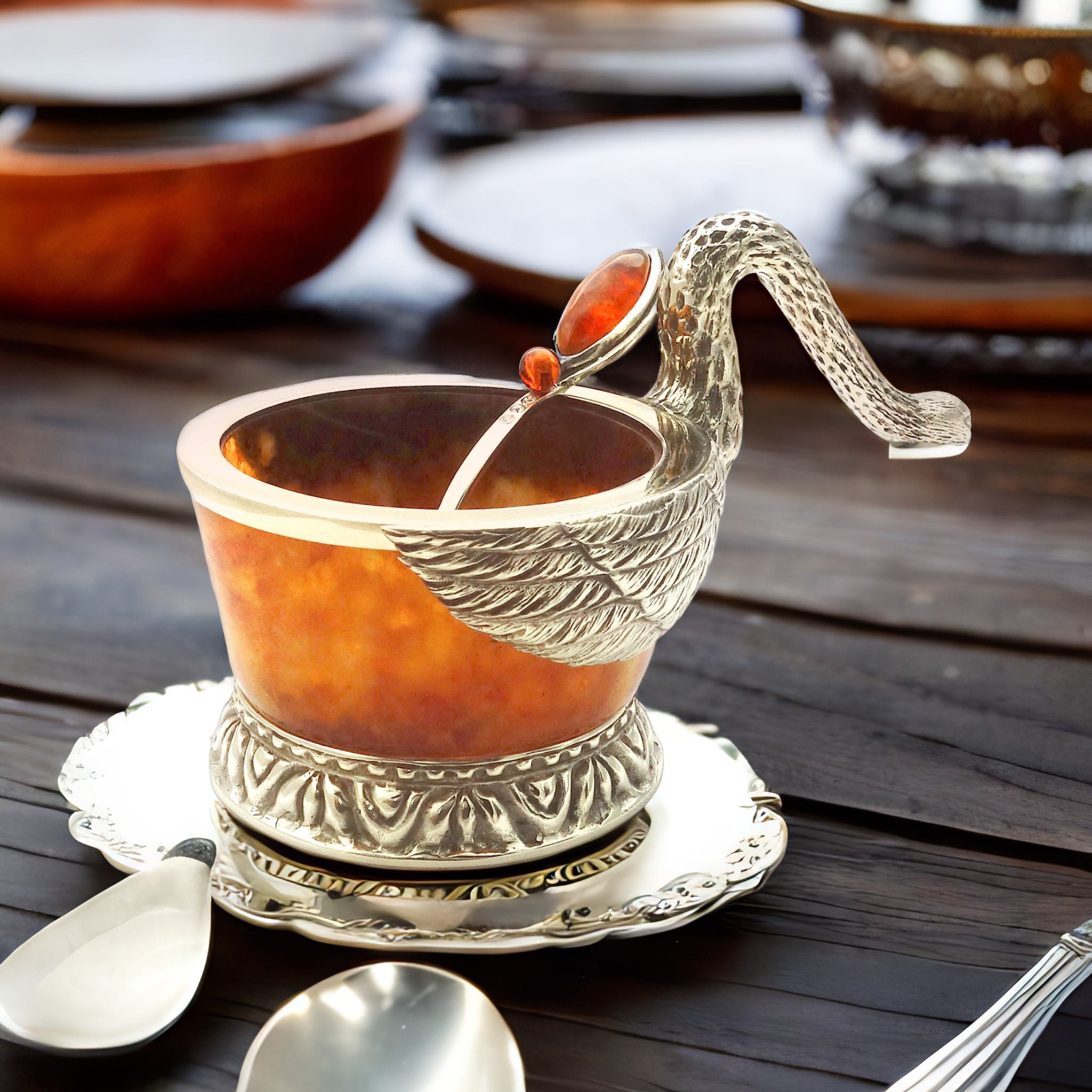 Янтарь — это символ богатства и уюта. Благодаря своему уникальному световому отражению, он наполнит ваш интерьер теплом и уютом. Лебеди из бронзы, украшающие солонку, придают изделию особенный шик и лоск. Это идеальный выбор, если вы хотите сделать подарок любимым или удивить своих гостей. Проявите свой вкус и любовь к эксклюзивности с нашей янтарной солонкой. |