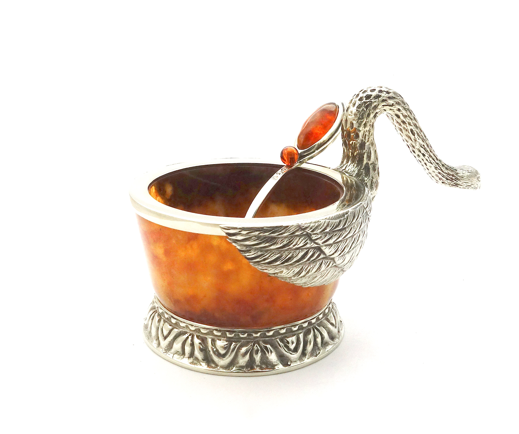 Украсьте ваш стол особенным аксессуаром — янтарной солонкой, украшенной элементами из бронзы в виде лебедя. Солонка не просто выполняет свою основную функцию, но и станет ярким декоративным украшением вашего стола. Наша солонка выполнена из натурального янтаря, благодаря чему она обладает уникальными свойствами этого камня.