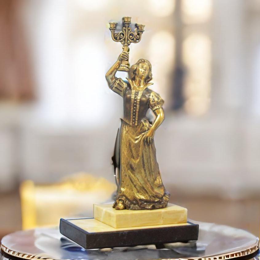 В нашем магазине Уникальные подарки появилась особенная новинка – Бронзовая статуэтка Дама с канделябром. Это не просто предмет интерьера, это история, застывшая в бронзе, которую можно передать по наследству. Статуэтка выполнена из качественной бронзы, обладает превосходной детализацией и исключительными артистическими качествами. Настоящий шедевр для истинных ценителей искусства!