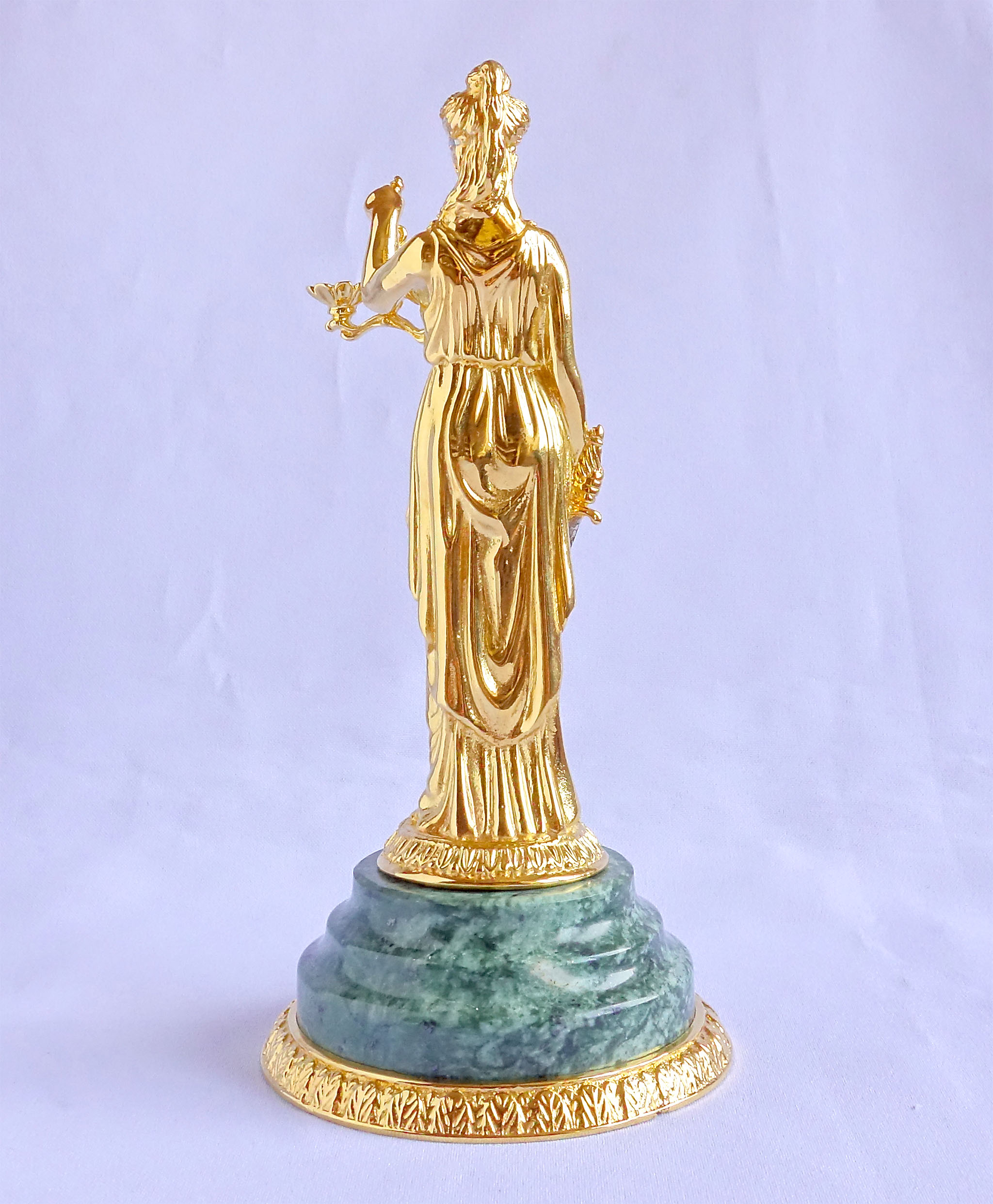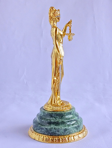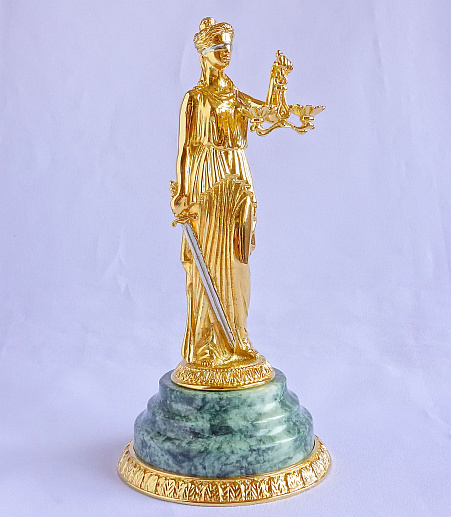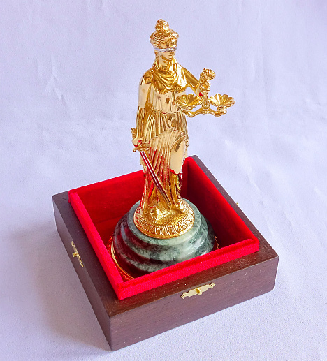 Перед Вами удивительной красоты подарочная статуэтка «Фемида», изображающая древнегреческую богиню правосудия. Статуэтка изготовлена из латуни по традиционной златоустовской технологии художественного литья с применением золочения и никелирования, также установлена на пьедестал из натурального змеевика. Такой сувенир станет достойным подарком для человека справедливого и рассудительного, она украсит собою его кабинет и наполнит рабочую атмосферу благочестием и покоем. |