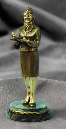 На пьедестале стройная девушка - олицетворение проводницы, которая обслуживает нас при поездках на ЖД транспорте. Размер -D85*210, используемые материалы - змеевик/бронза. Профессиональный праздник железнодорожников - 1 воскресенье августа. Закажите оптом такие статуэтки и подарите их своим очаровательным женщинам- проводникам в железнодорожных поездах. |
