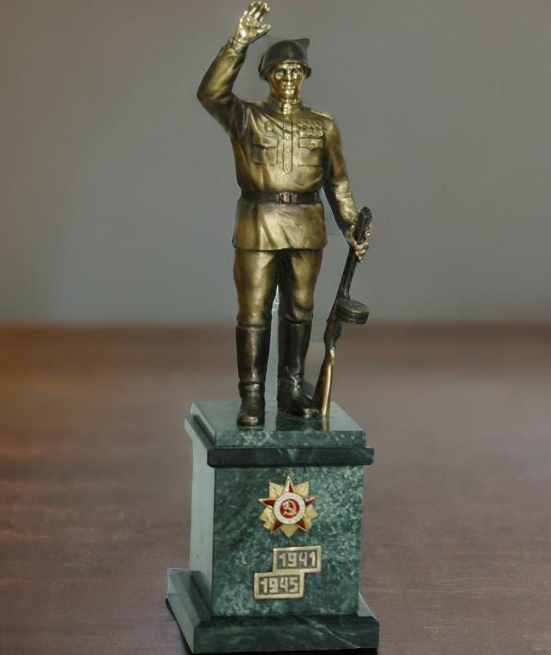 Предлагаем в ваше внимание высококачественную бронзовую статуэтку Солдат, украшенную реалистичным изображением советского солдата с орденом Отечественной войны. Это идеальный подарок для тех, кто ценит историю нашей страны и подвиги наших предков. Статуэтка выполнена из прочной бронзы, что гарантирует ее долговечность и сохранность в первозданных деталях. Подарок, который может передаваться из поколения в поколение. Это не просто подарок – это символ мужества, отваги и несокрушимого духа нашего народа. Не упустите возможность порадовать себя или своих близких этим замечательным историческим сувениром. |