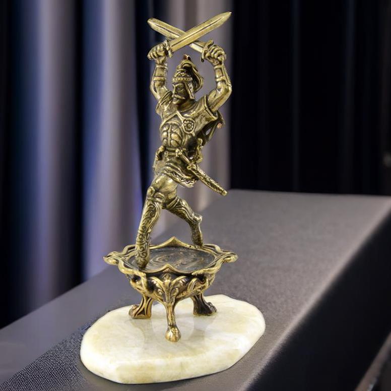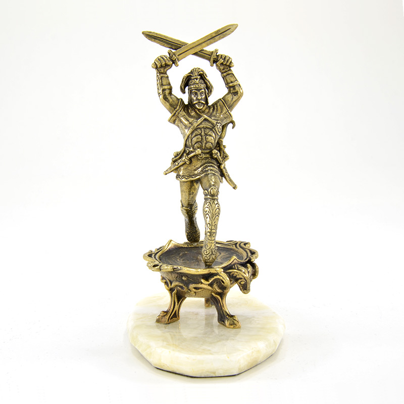 Бронзовая статуэтка Сослана - героя нартского эпоса, воплотившегося из камня. Подарок для настоящих воинов, а значит руководителей. Согласно данным историко-этимологического словаря осетинского языка Сослан и Сосруко - имена одного и того же героя. Сослан изображен в грациозной боевой стойке на носках с двумя перекрещенными над головой мечами. На голове герой носит шлем, а за спиной колчан, наполненный стрелами. Амуницию его дополняют два кинжала на поясе, наручи и длинные сапоги, расписанные нартским узором. |