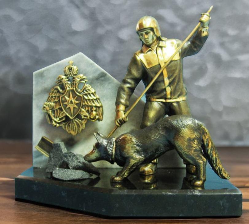 Представляем вашему вниманию Бронзовую статуэтку Спасатель МЧС. Это уникальный, авторский продукт, созданный с душой и любовью. В каждой детали статуэтки просматривается профессионализм и искренность наших мастеров. Статуэтка представляет собой спасателя МЧС с собакой, что символизирует преданность, мужество и бесстрашие. Особое внимание стоит уделить уникальным материалам, из которых изготовлена статуэтка. Так, основой служит солидная подставка из мрамора и змеевика, что придает изделию особый шарм и благородство. Эксклюзивное дополнение — эмблема МЧС, что делает статуэтку настоящим артефактом.