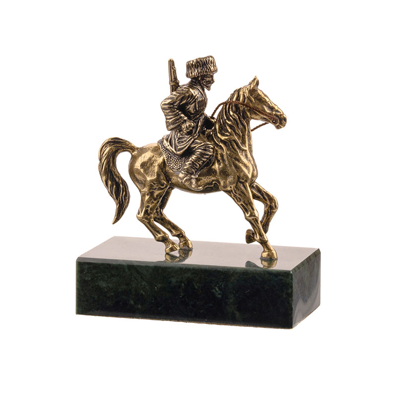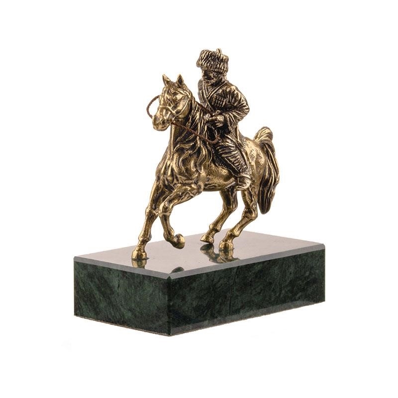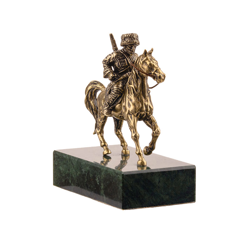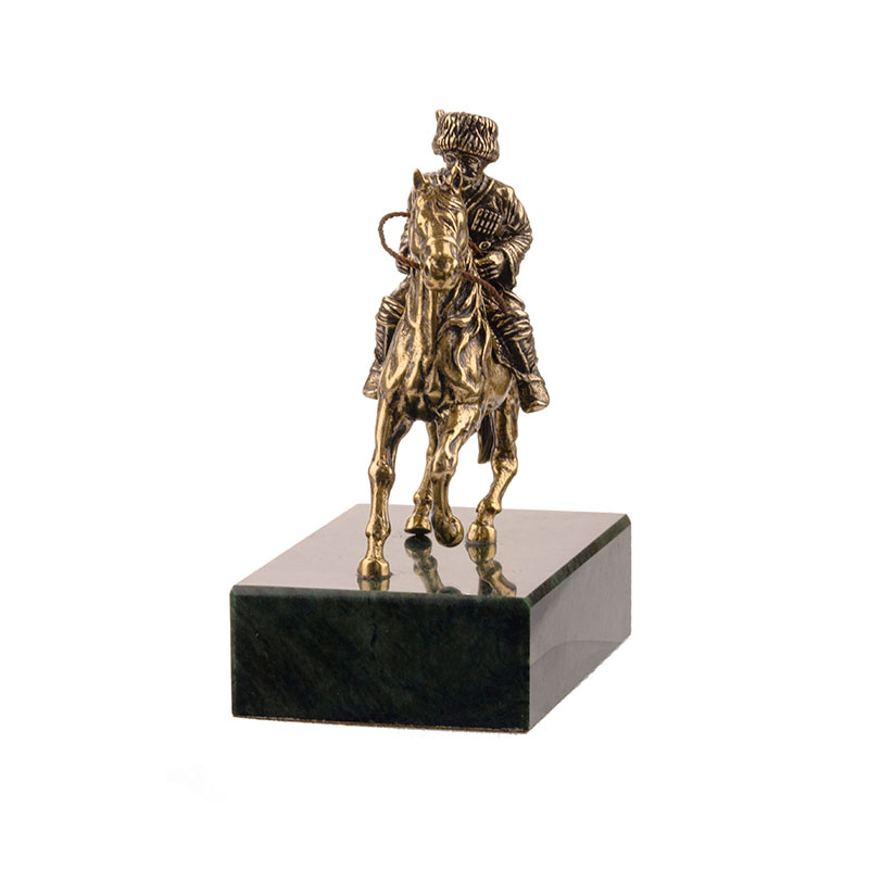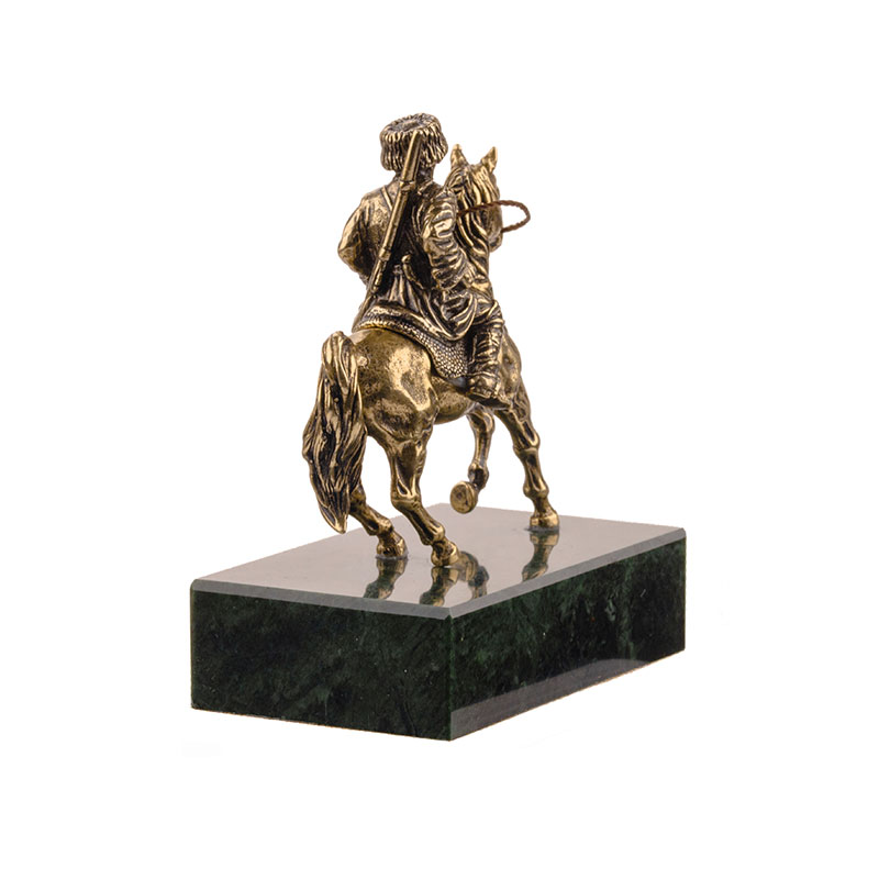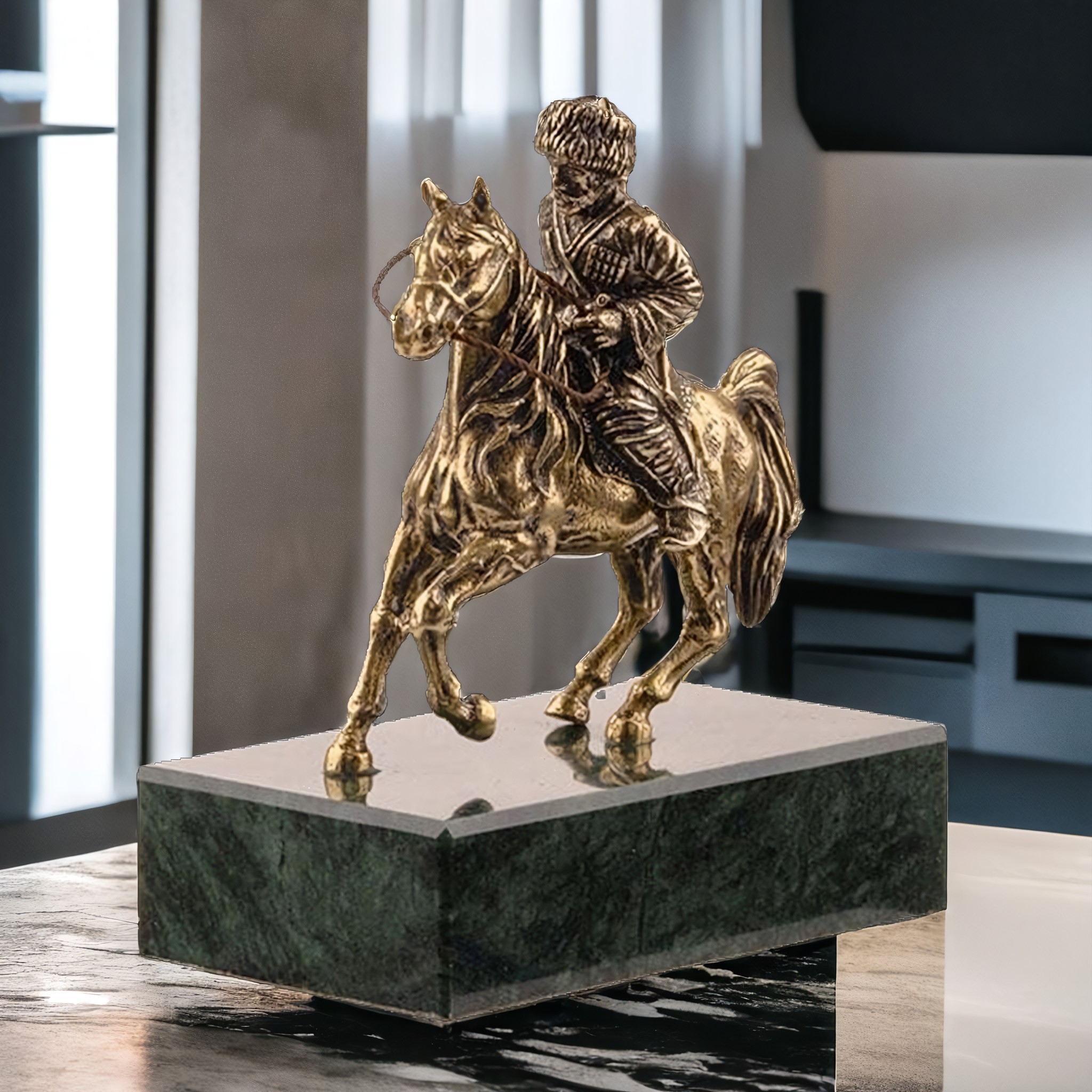 Бронзовая статуэтка «Наездник» — это не просто красивый предмет интерьера, это произведение искусства, которое впечатлит каждого, кто увидит его. Изготовленная из яркой, блестящей бронзы, она бросается в глаза и привлекает взгляд. Статуэтка выполнена в форме всадника на коне, что символизирует движение, энергию и силу. Бронзовый наездник, словно замер в быстром рывке, показывая свою мощь и решимость. Основание изделия выполнено из змеевика — уникального минерала темно-зеленого цвета. Этот материал подчеркивает блеск бронзового наездника и придает изделию дополнительную глубину и текстуру.