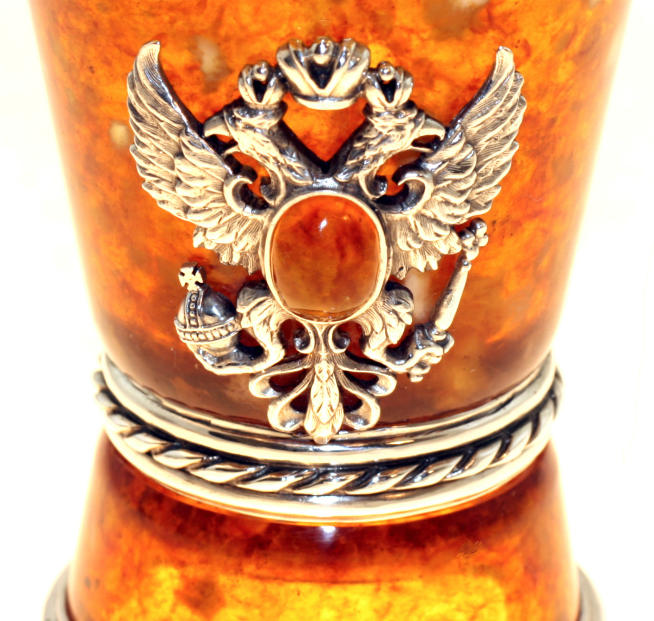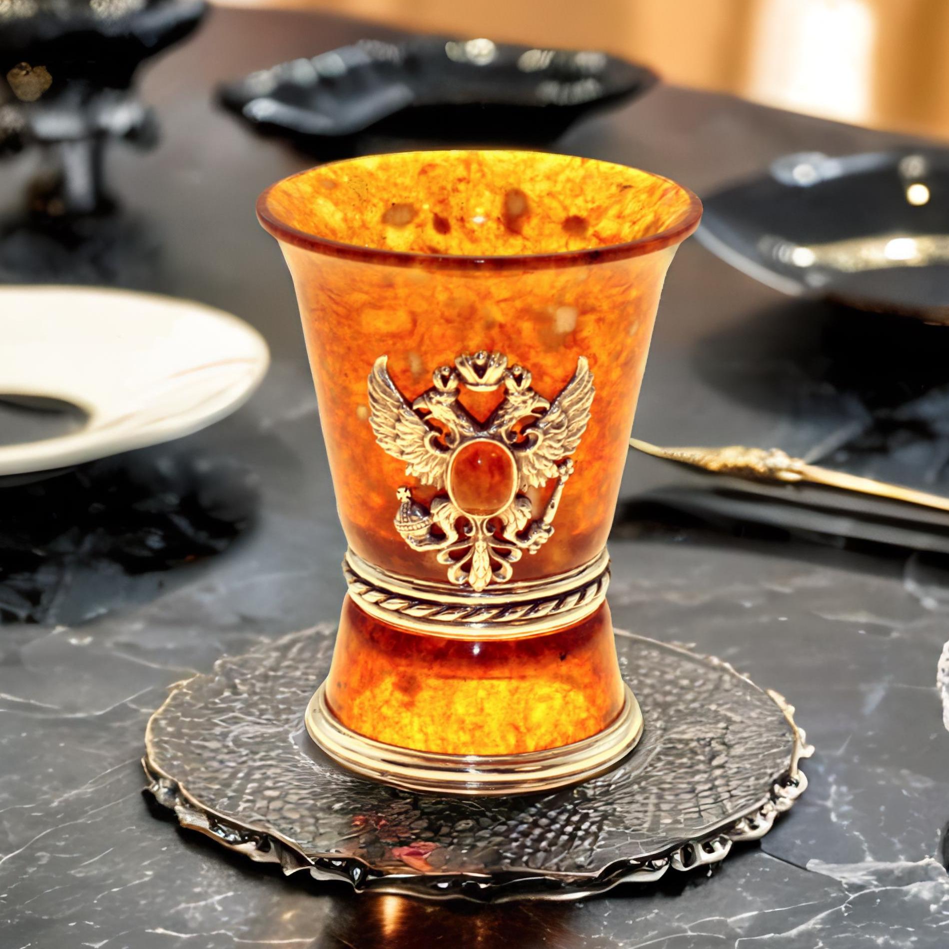 Украсьте ваш сервированный стол изысканными деталями! Представляем вашему вниманию Стопку для водки из янтаря со вставками из бронзы, выполненными в форме герба России. Сделанная из натурального янтаря, наша стопка станет не только практичной частью вашего интерьера, но и его ярким украшением. Бронзовые элементы в виде герба России придают стопке особую чувственность и атмосферу, делая каждое ее использование особенно памятным.