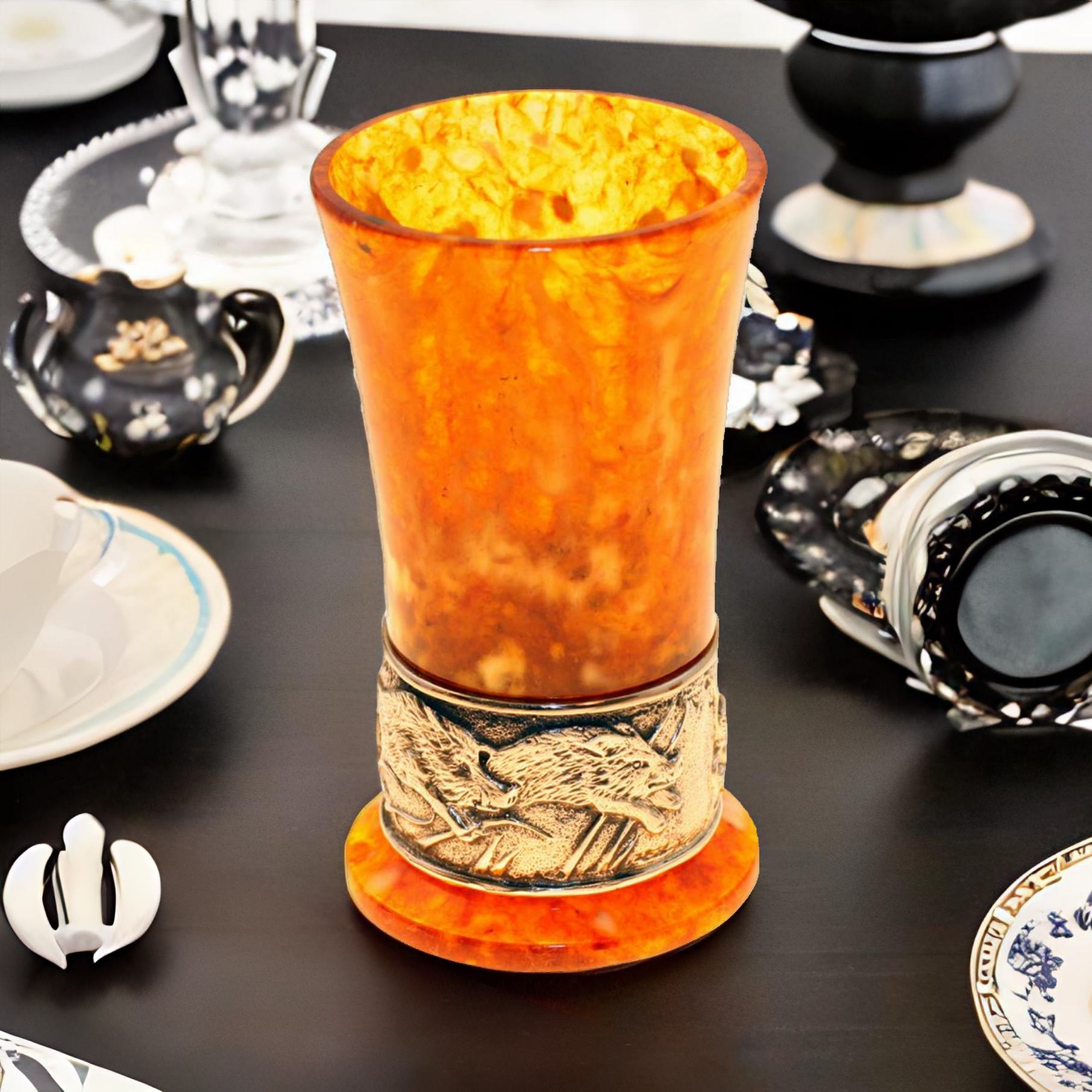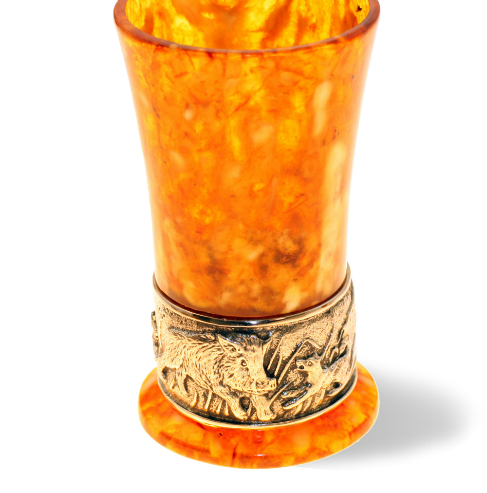 Представляем вашему вниманию эксклюзивную стопку для водки из камня (янтарь), декорированную бронзовыми элементами, посвященными тематике охоты. Этот изысканный товар станет отличным дополнением к вашему домашнему бару или подарком для настоящего охотника или ценителя традиционных напитков. Наслаждайтесь благородным напитком, чувствуя вес и теплоту настоящего янтаря в вашей руке. Яркая и насыщенная палитра цветов янтаря, в сочетании с бронзовыми вставками, создающими сцены охоты, превращают обычное употребление водки в церемонию.