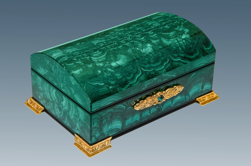 Каждый деталь в этом сундучке отмечена великолепием природного камня – неповторимым малахитом! Богатый зеленый оттенок этого минерала в сочетании с позолоченной бронзой создает атмосферу настоящей роскоши. |
