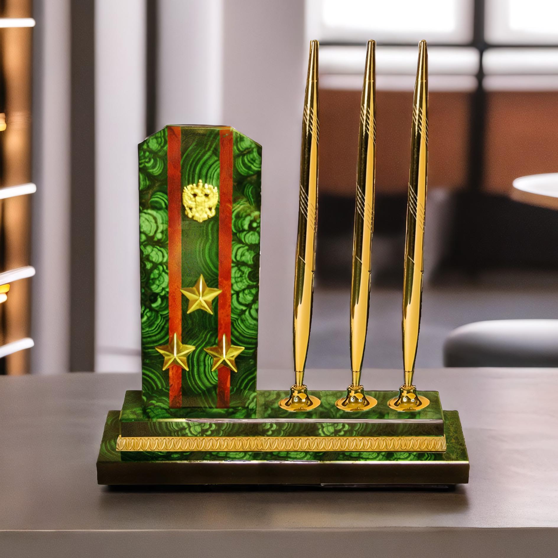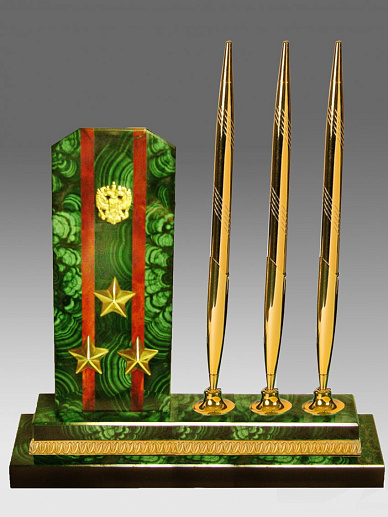 Представляем вашему вниманию сувенир из камня «Погон». Уникальный декоративный предмет, который будет служить отличным подарком для коллеги, друга или любимого человека. Сувенир изготовлен из профессионально обработанных видов камня — малахита, мрамора и долерита. Это придаёт ему неповторимую текстуру и чарующий окрас. В комплекте с сувениром идут 3 ручки в подставках, что делает его не только декоративным элементом, но и полностью функциональной вещью для организации вашего рабочего пространства.