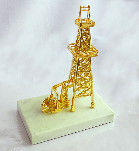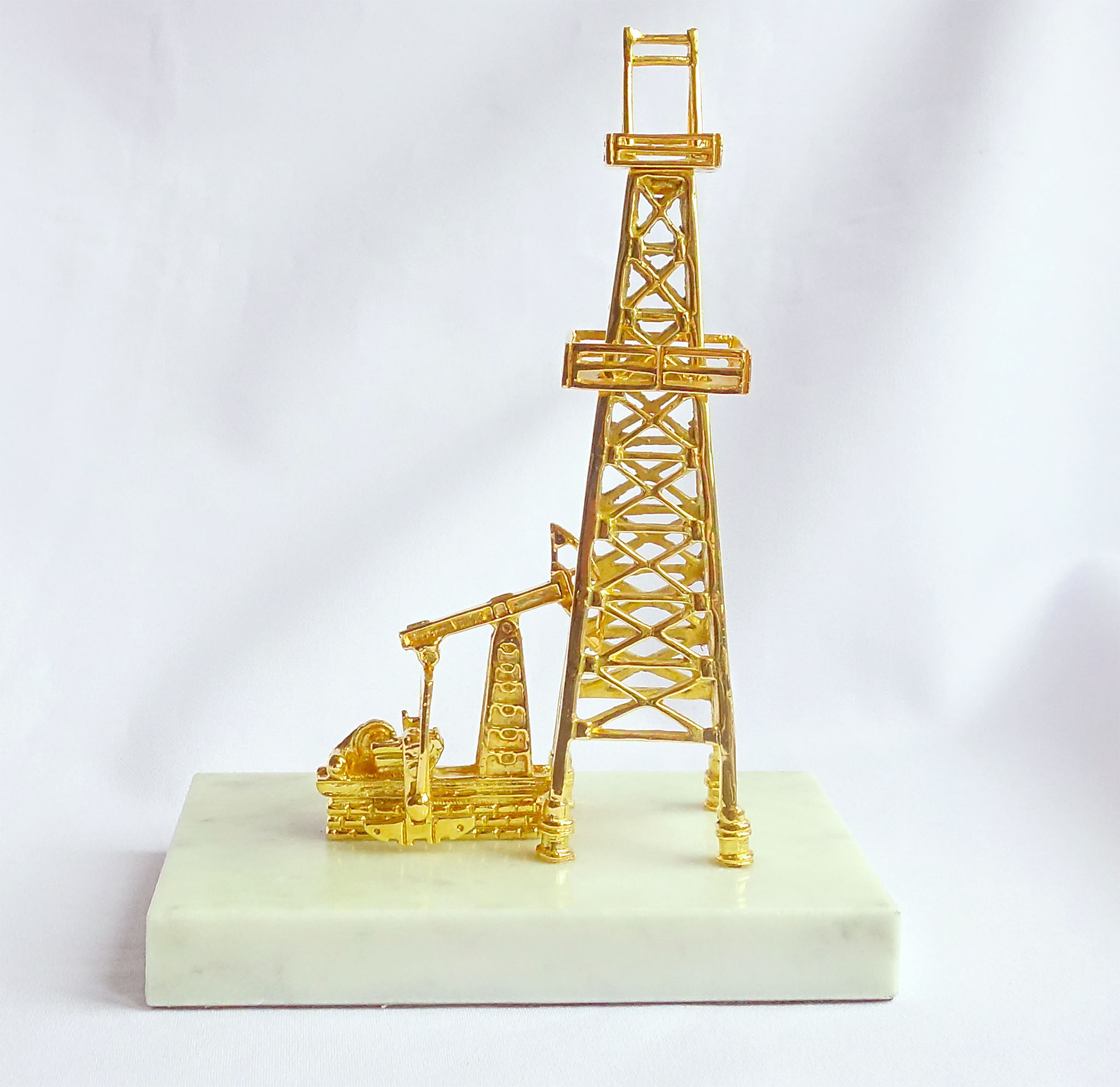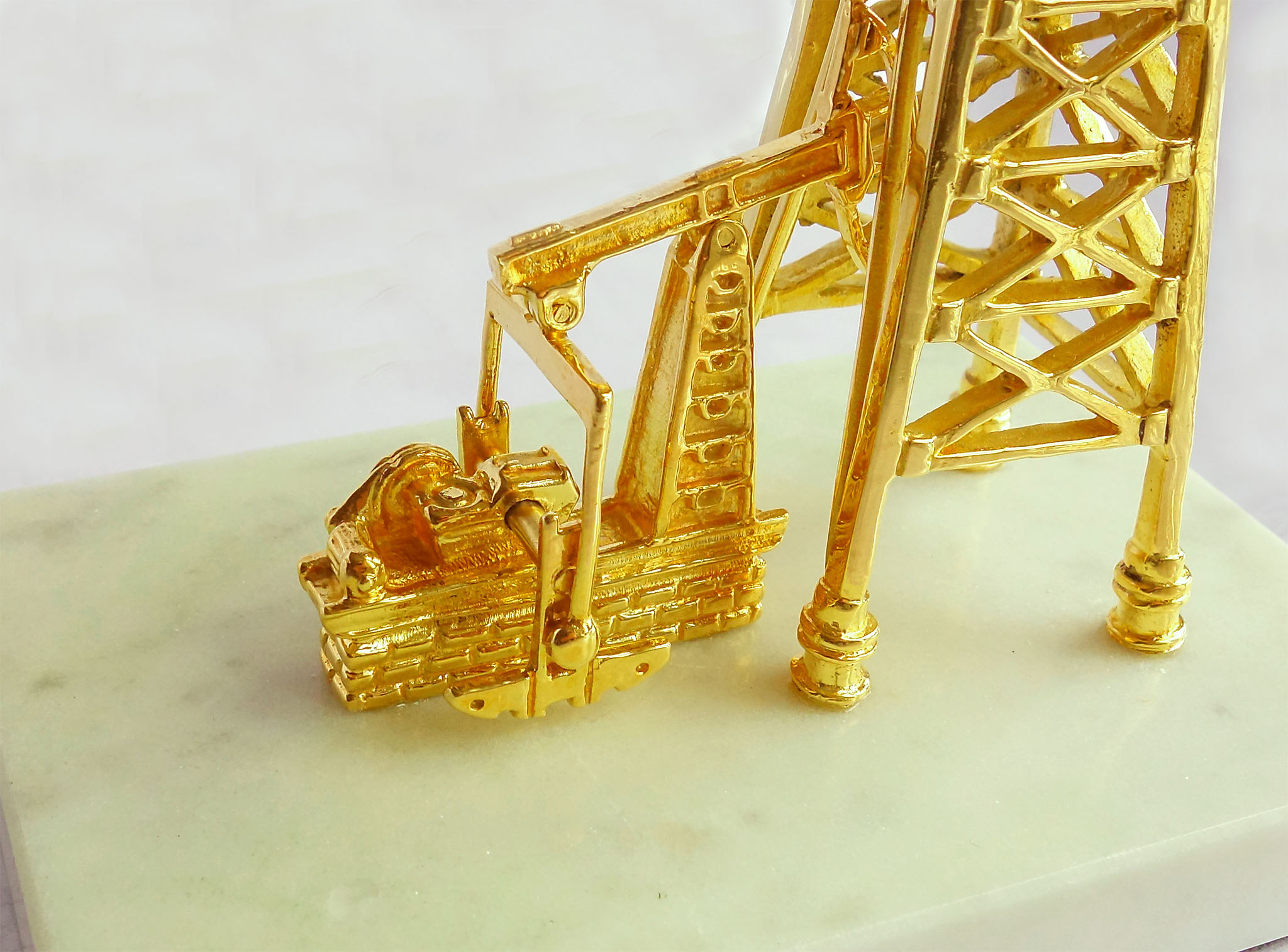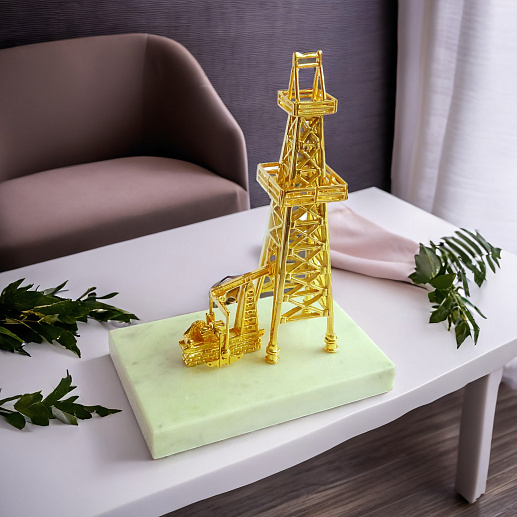 Каждый элемент сувенира Нефтяная вышка покрыт золотом, что придает ему особенного шика. К тому же, дополнительное украшение в виде подставки из мрамора делает его еще более привлекательным. Наша компания гарантирует качество изделия и бережную доставку до адресата. |