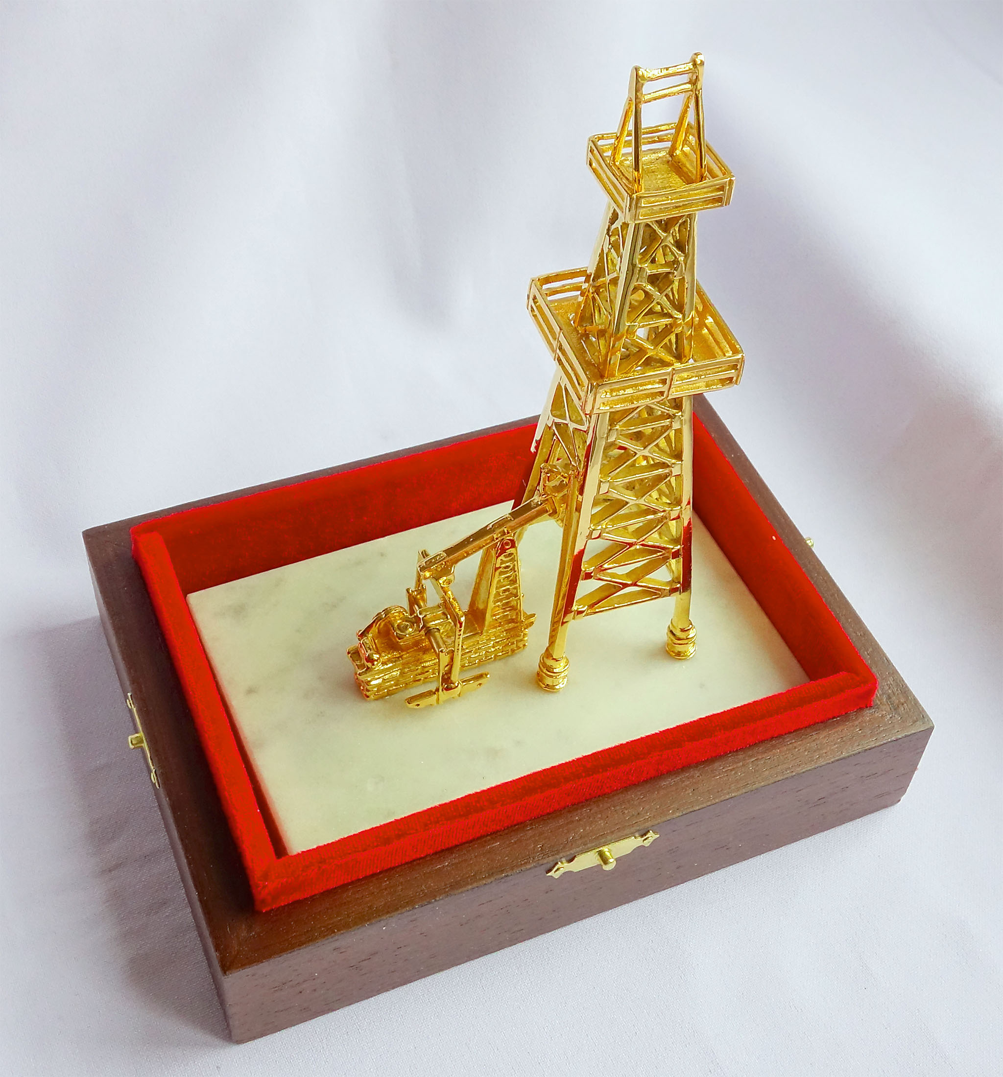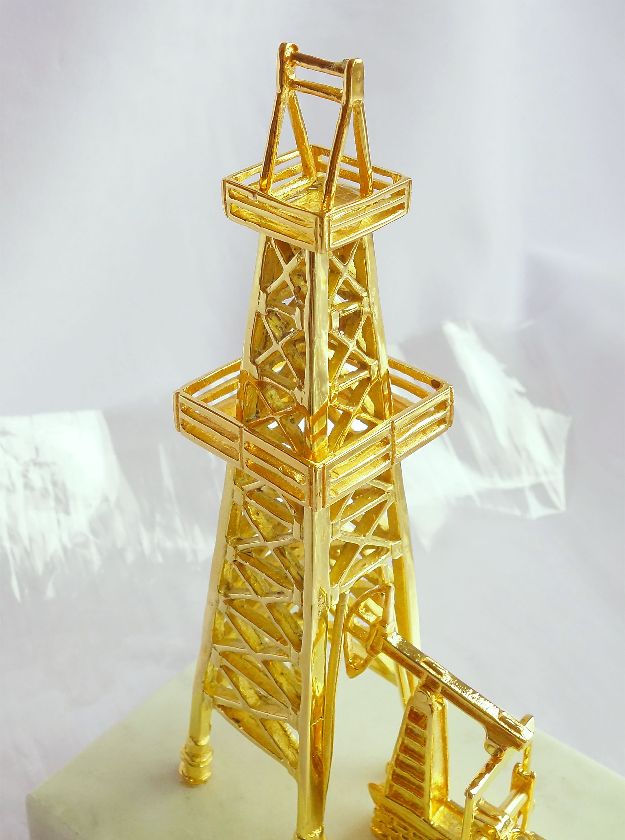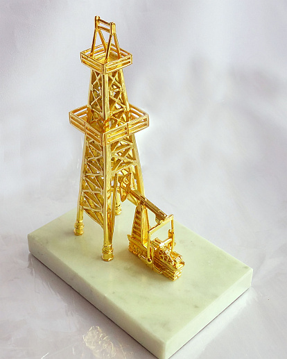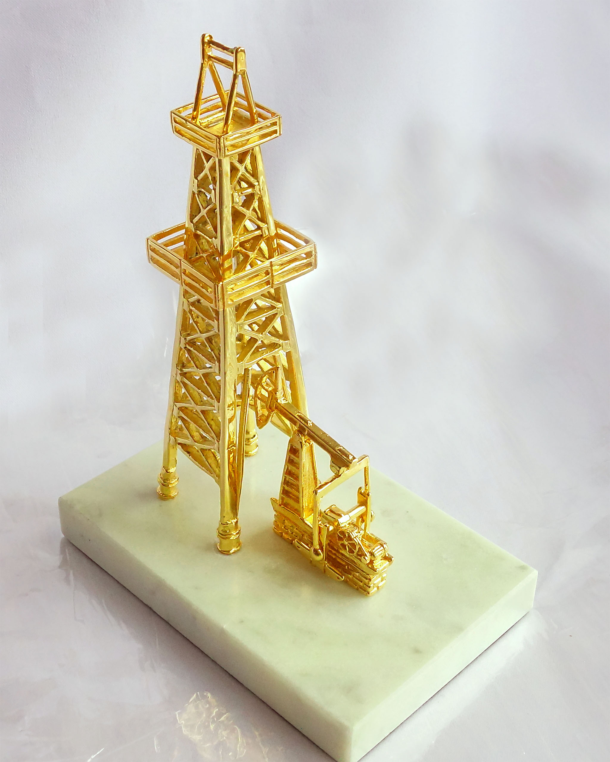 Каждый элемент сувенира Нефтяная вышка покрыт золотом, что придает ему особенного шика. К тому же, дополнительное украшение в виде подставки из мрамора делает его еще более привлекательным. Наша компания гарантирует качество изделия и бережную доставку до адресата. |