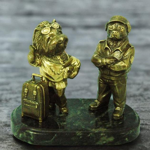 Сегодня мы рады представить Вашему вниманию уникальный бронзовый сувенир Провожающий. Этот неповторимыйпредмет несёт в себе целую историю, могущественно цепляющую взгляд любого созерцателя. Провожающий — это изящная бронзовая композиция, которой представлен пес в костюме охранника и собачка в модной одежде с бусами и очками. Собачка девушка держит в ручках чемодан, что непременно вызывает улыбку и добавляет динамизма сцене.