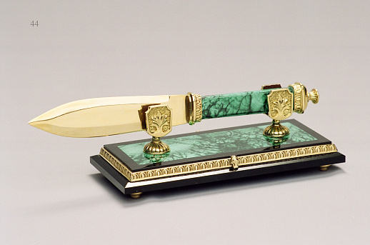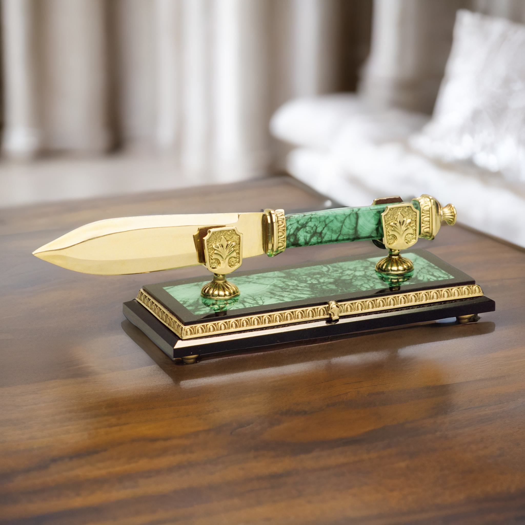 Внимание всем любителям необычных и оригинальных вещей! Представляем вам уникальный сувенир “Нож для резки бумаг”, выполненный из нежного малахита и твердого долерита, украшенный элементами из бронзы с изысканным золотым покрытием. Этот товар — отличный пример мастерства и уникального дизайна. Каждый экземпляр является произведением искусства, не имеющим аналогов. Позвольте себе немного роскоши в повседневной жизни или удивите близких и друзей этим элегантным подарком.