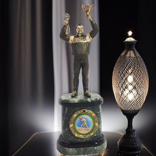 Приз выполнен из высококачественной бронзы и установлен на подставке из змеевика – материала, который отличается своей прочностью и эффектным внешним видом. Благодаря этому приз будет радовать вас своим идеальным состоянием на протяжении многих лет. |