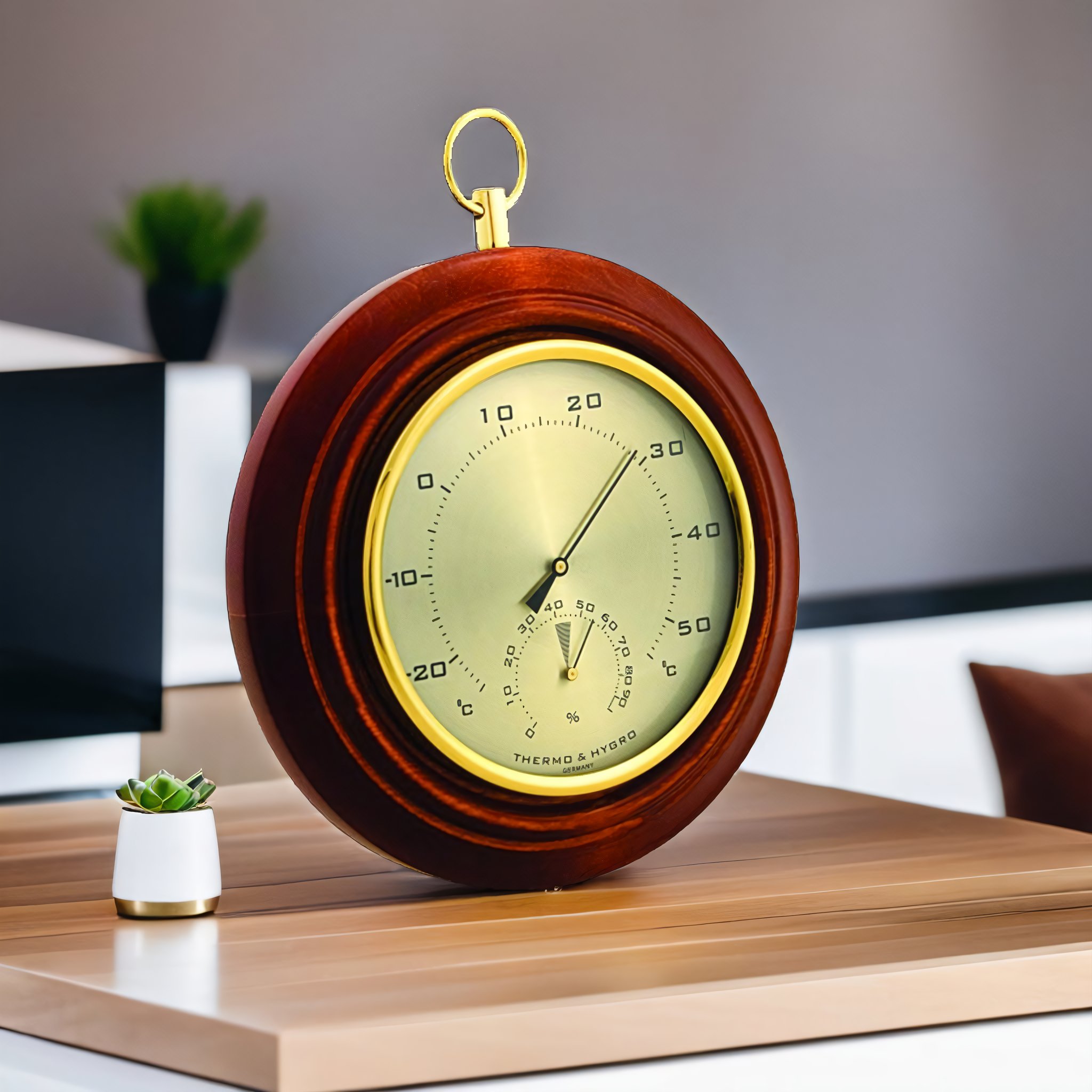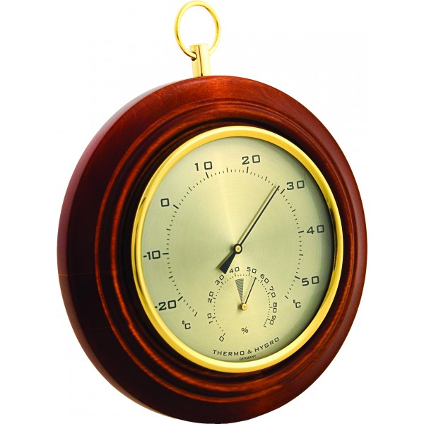 Рамка изделия выполнена из массива дерева, что придаёт ему особый шарм и позволяет вписаться в интерьер любого помещения. Круглая форма прибора делает его удобным для расположения на стене.