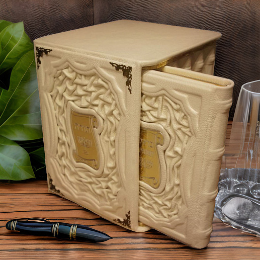 Книга является основой существования еврейского народа и выражает сущность еврейского образа жизни, она - фундамент мироздания, в ней заключены план Божественного Творения и те "инструменты", с помощью которых Бог творит мир. В России такого издания нет,производство книг,Израиль. Короб: Накладка - гравировка на металле . Уголки , замок , ножки - металл особого сплава Книга: Накладка - гравировка на металле |